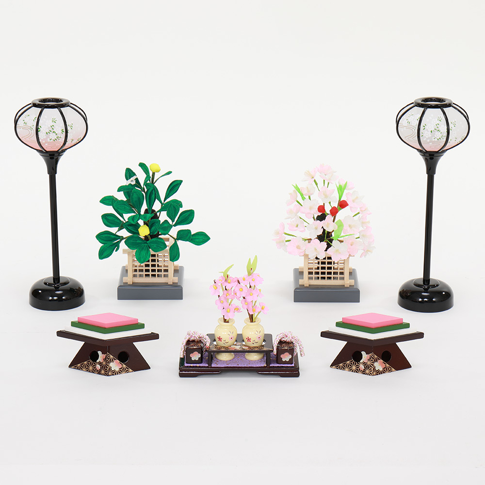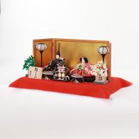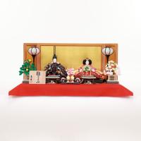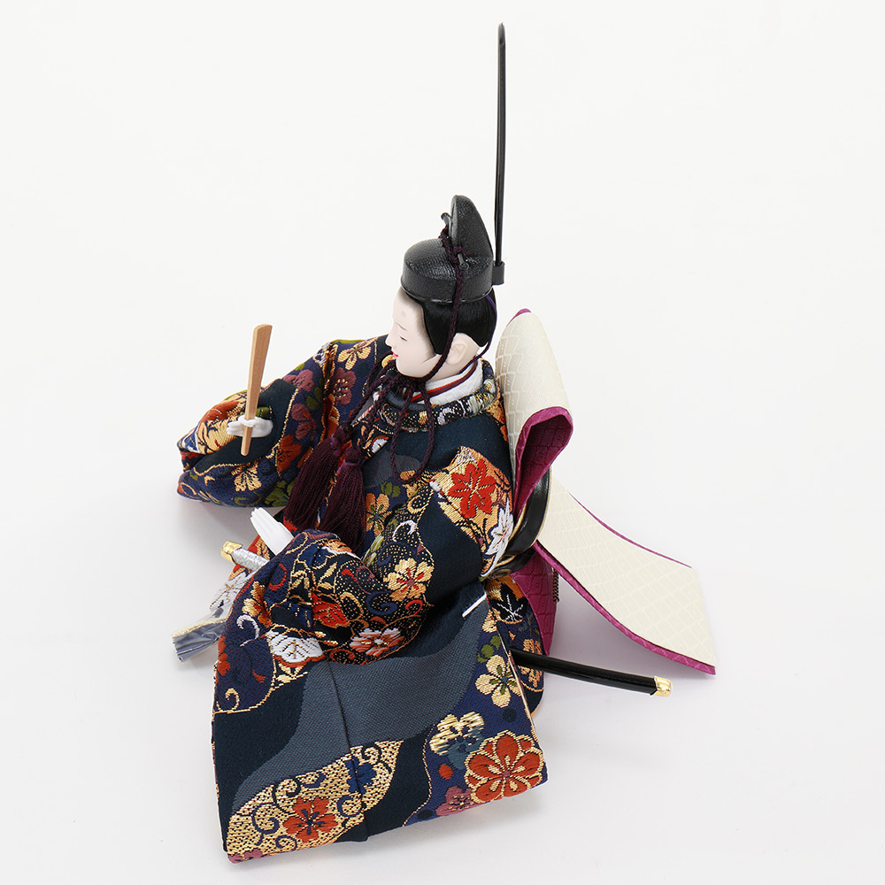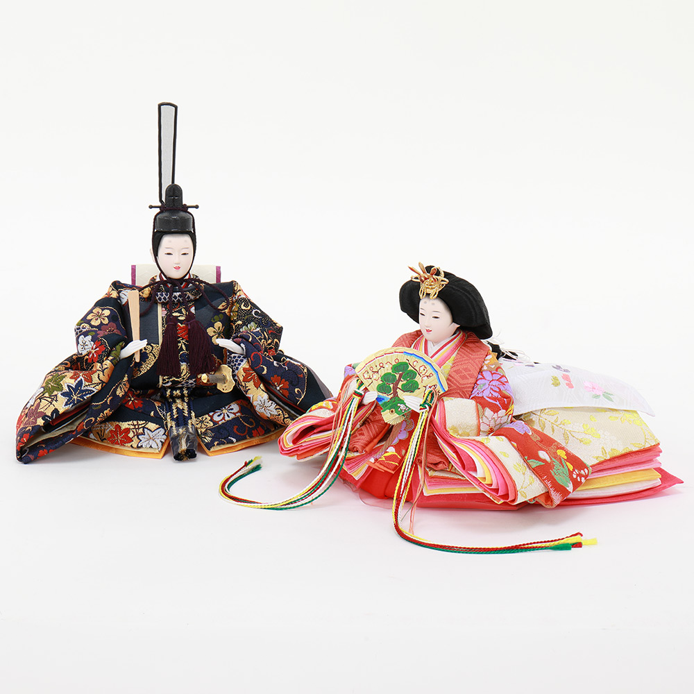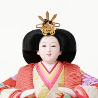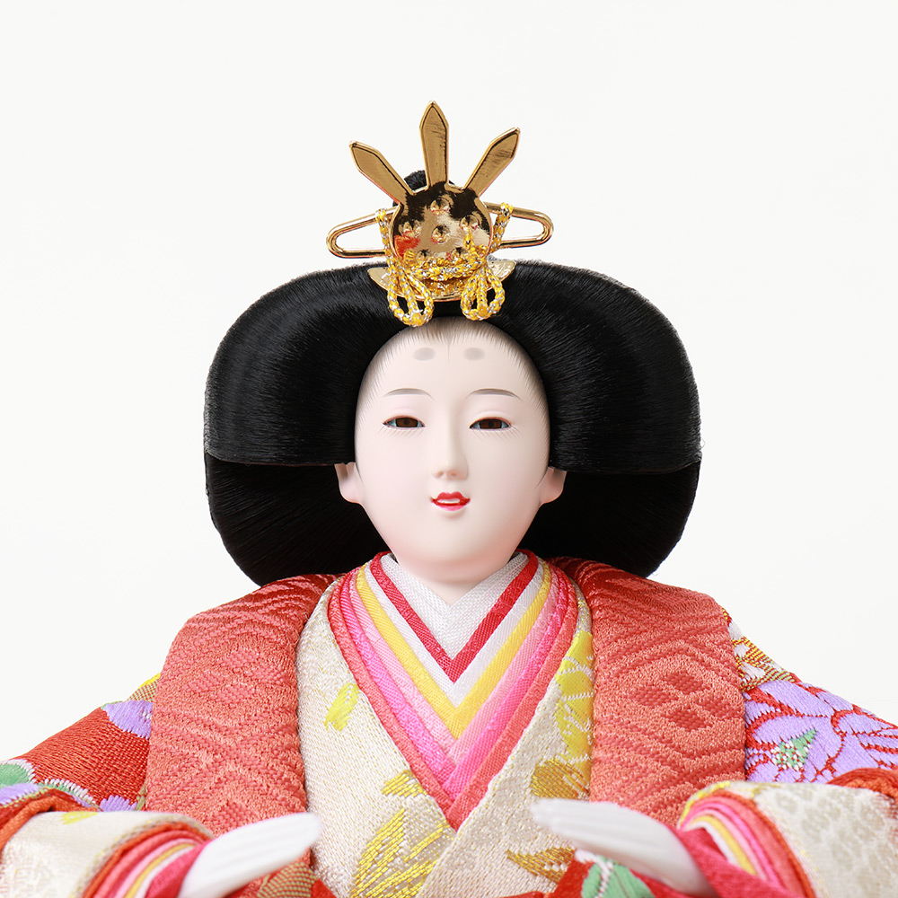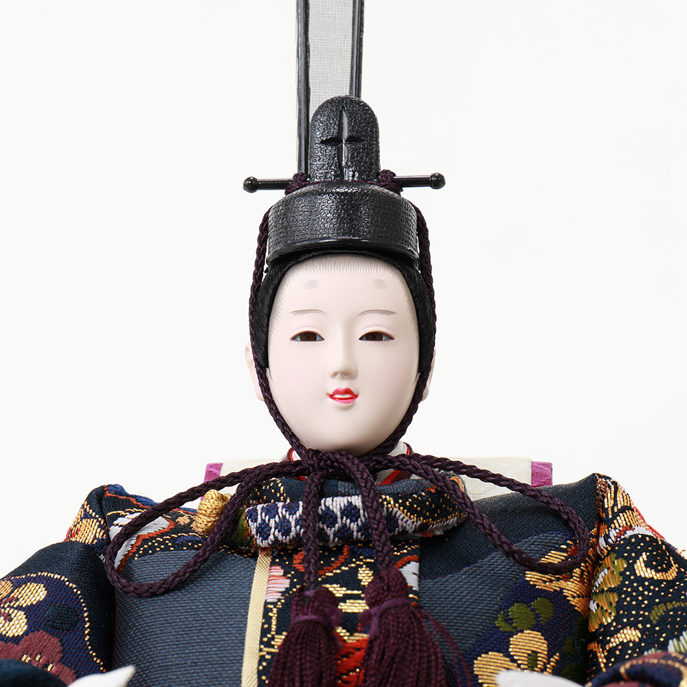 艶やかに仕立てられた、豊かな趣の衣裳が映えて。落ち着いた色合いのおひな様が、雅の雰囲気を感じさせる親王飾りです。
