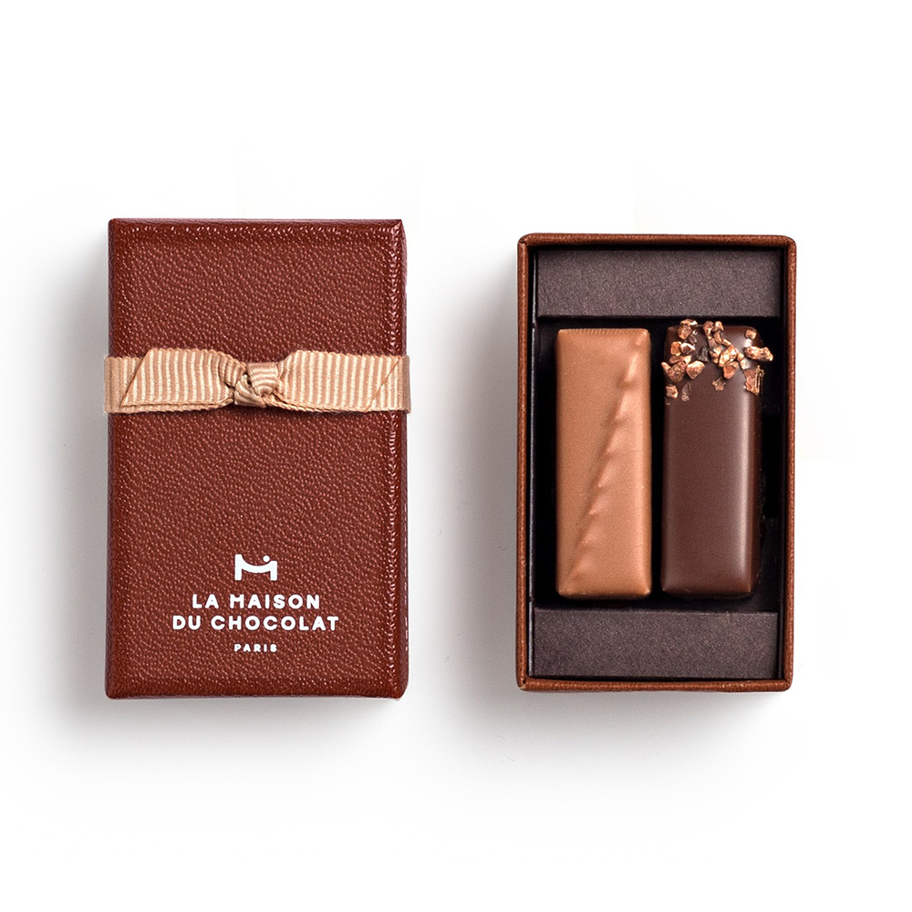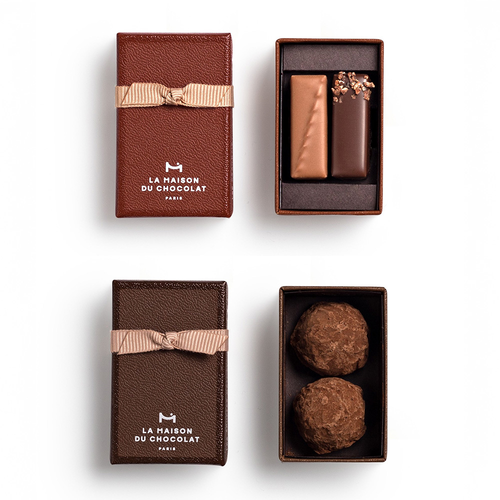 ラ・メゾン・デュ・ショコラを代表するアイコニックボックス「アタンション2粒入」と、ガナッシュムースを薄いチョコレートのベールで包んだ「トリュフ2粒入」のセット