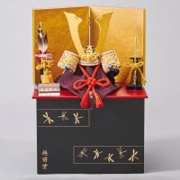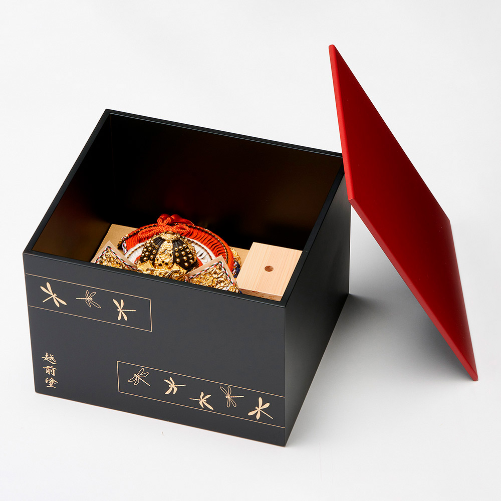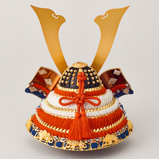 朱赤中白威しの兜。鍬形台には龍の飾り金具を、飾り台には勝ち虫と呼ばれる縁起の良いトンボの柄を施しました。