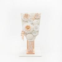 繊細で可愛らしいつまみ細工のお花とさらりと揺れる飾りがついた上品で愛らしいコンパクトサイズの羽子板です。持ち手には京都の西陣織、羽子板にはシルク(正絹)を使用しており、美しさが際立ちます。