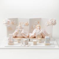 女の子の健やかな成長を願う桃の節句、従来の色鮮やかな雛人形とはちょっと趣向を変えて、親王(お雛様とお内裏様)だけでなく、お道具や屏風、ぼんぼりなど全てを白とベージュでシンプルに仕上げました。