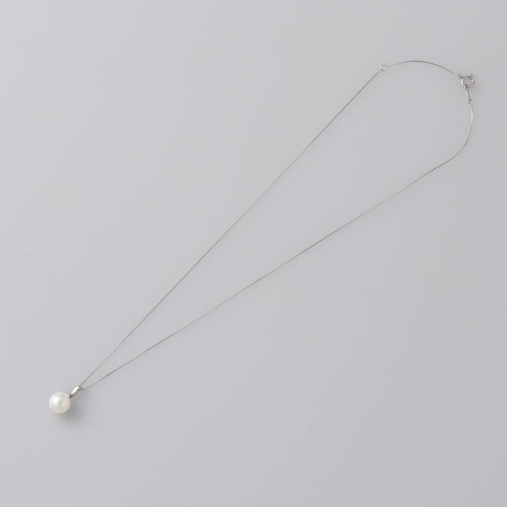 大珠8mmのアコヤ真珠を使用したペンダント。片穴の真珠の中から、テリの良い物を選りすぐってのご紹介です。