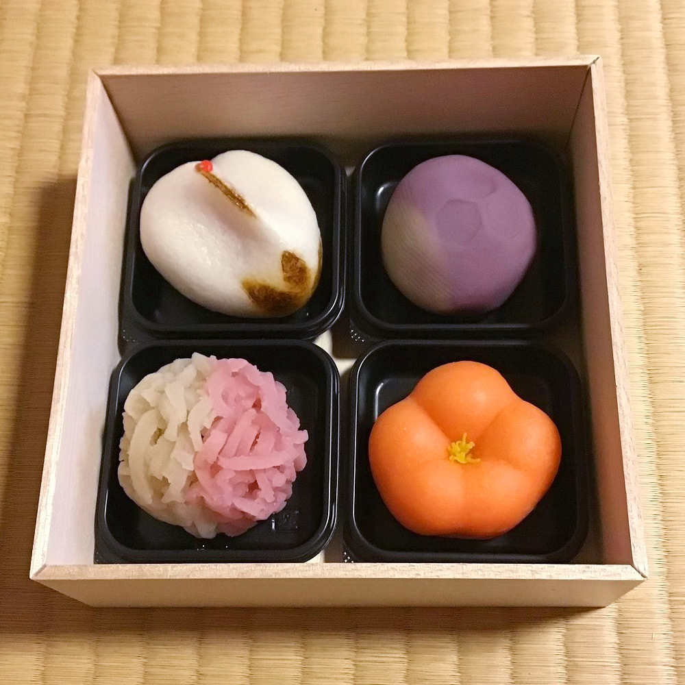 本店の茶房で味わえる「くずきり」で広く知られる祇園の老舗<鍵善良房>。迎春の上生菓子を4種類、各1個ずつ詰合せてご紹介します。
