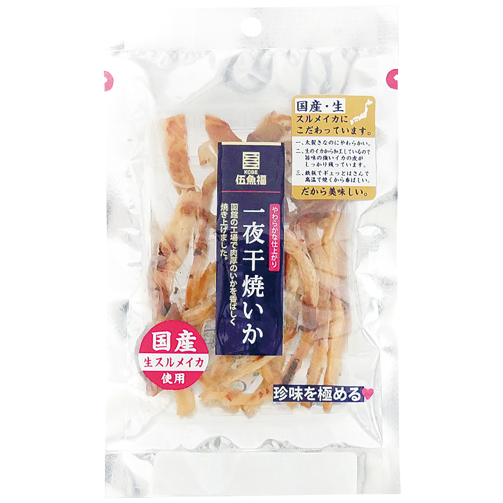 国産の生スルメイカを使用した、一夜干焼いか。太裂きなのにやわらかで、噛むほどに旨味が広がります。
