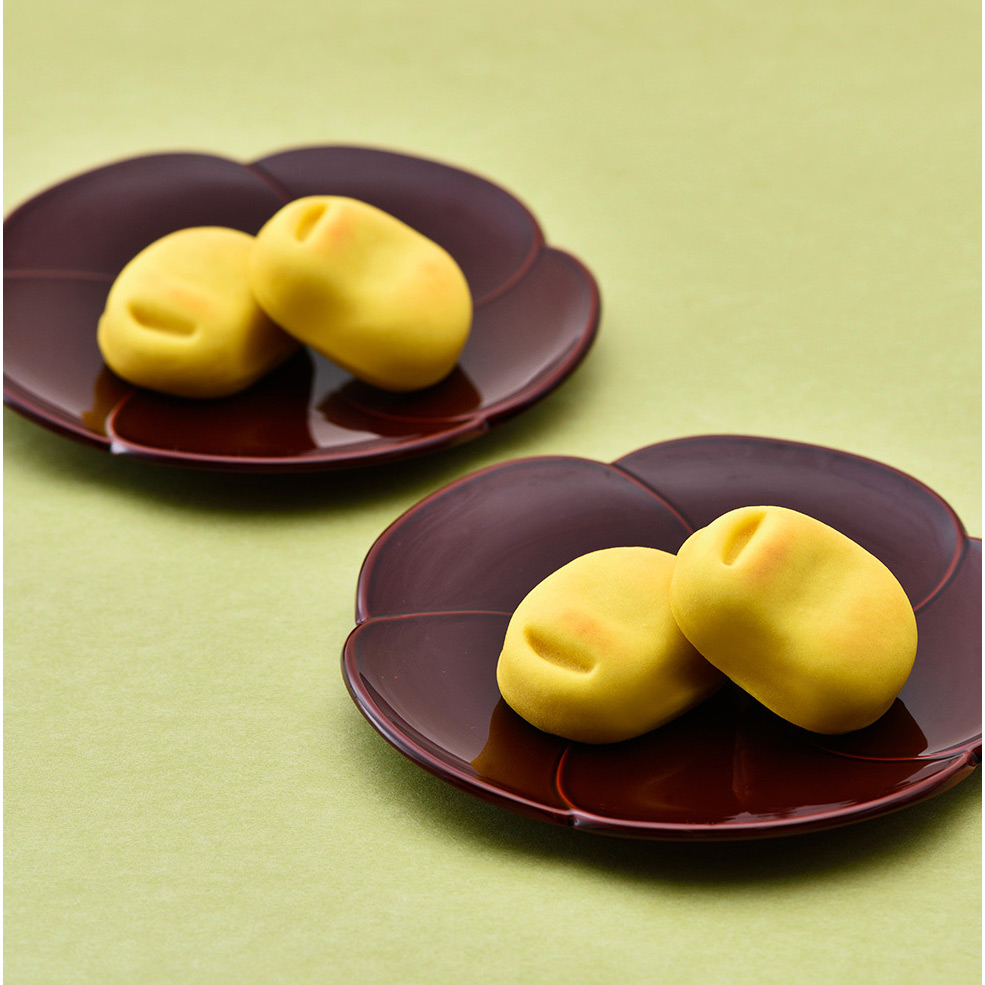 ふっくらとした桃山生地でほどよい甘さの白こしあんを包み仕上げた、春を呼び福を招くような愛らしい福豆の形の京菓子です。