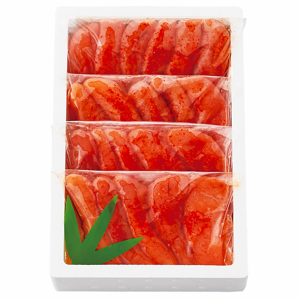 製造過程で少し破れた明太子を選別し、250gずつ小分けにしました。低温でじっくり漬け込んだ味わい深い辛子明太子です。