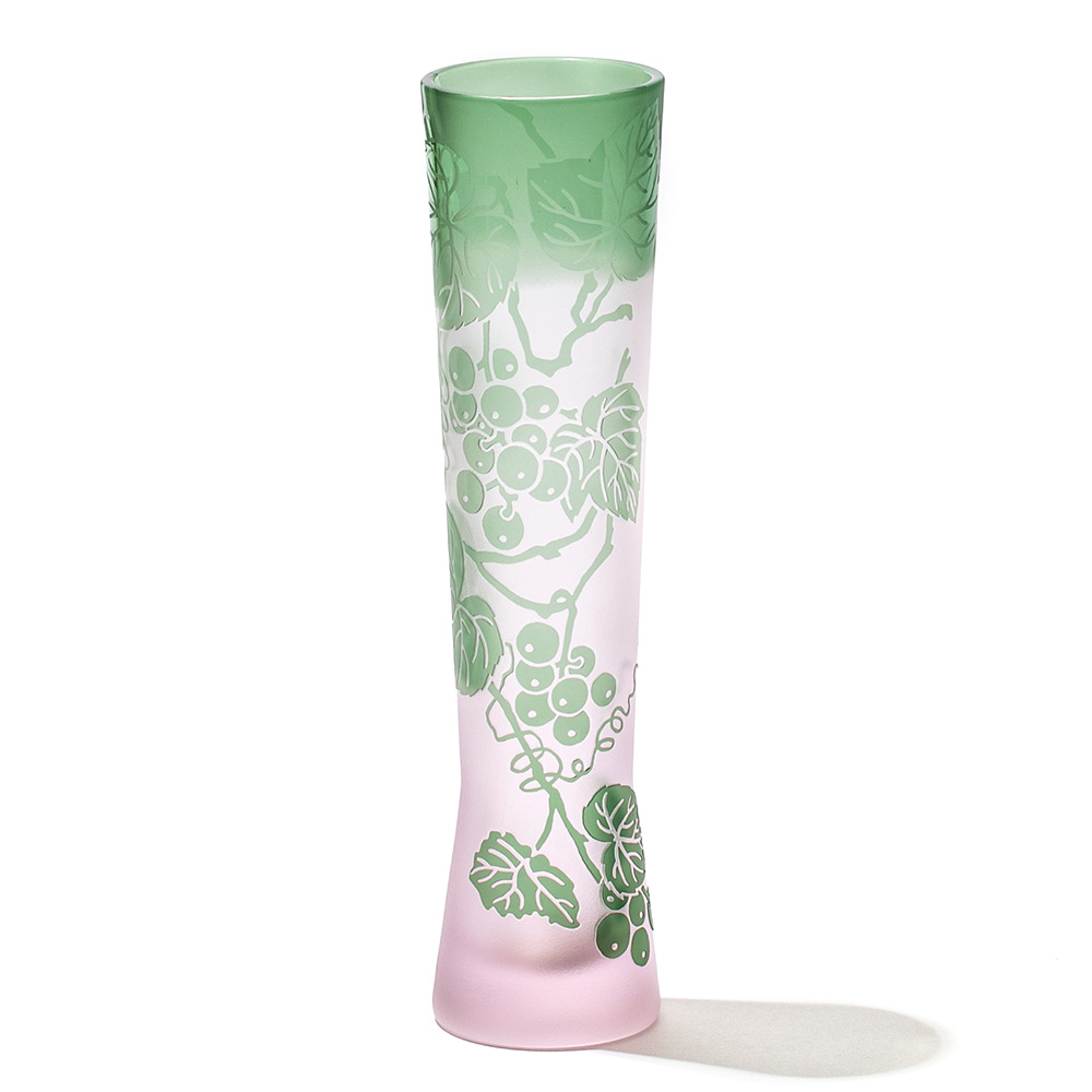 二層の色被せガラスを一つ一つ手吹きにて作り、その器に彫刻を手作業で施し、二色のコントラストで図柄を表現しています。彫刻したぶどうは、古くからその実の粒の多いことから「豊穣」と「多産」、蔓の伸びから「生命力」「結びつき」を象徴する縁起の良いモチーフです。