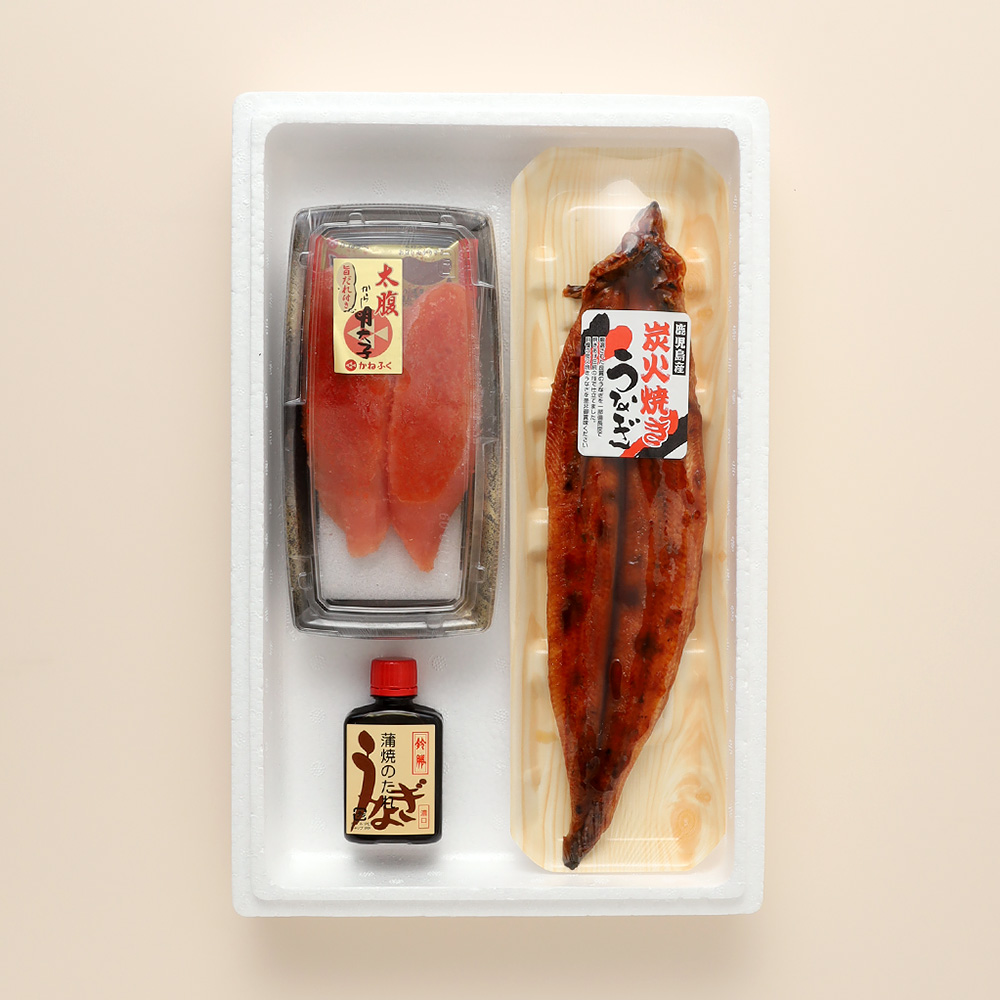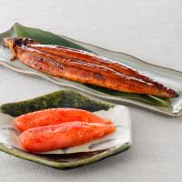 鹿児島県産うなぎ蒲焼、明太子の太腹をセットしました。
