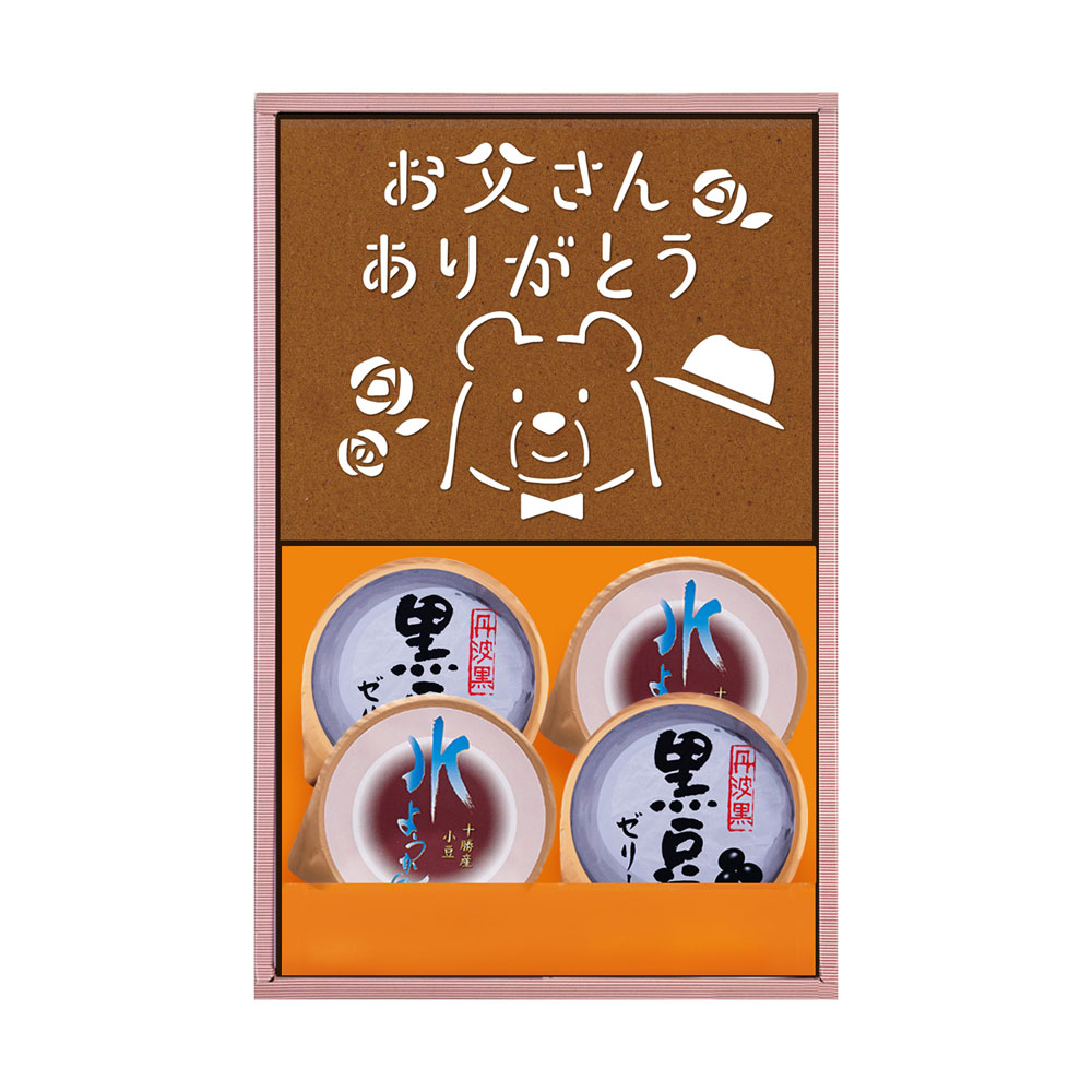 「お父さんありがとう」のメッセージとかわいいデザインをカステラの天面に刷り込んだ絵文字カステラ、さっぱりとした甘さが特徴の水ようかん、大粒で柔らかい丹波黒大豆を使用した黒豆ゼリーが入った父の日限定ギフトです。