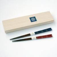 金銀のラインがアクセントになり、鮮やかな青と赤が目を引く夫婦箸です。桐箱入りで、ご結婚お祝いや退職のお餞別など、大切な方への贈りものにもおすすめです。