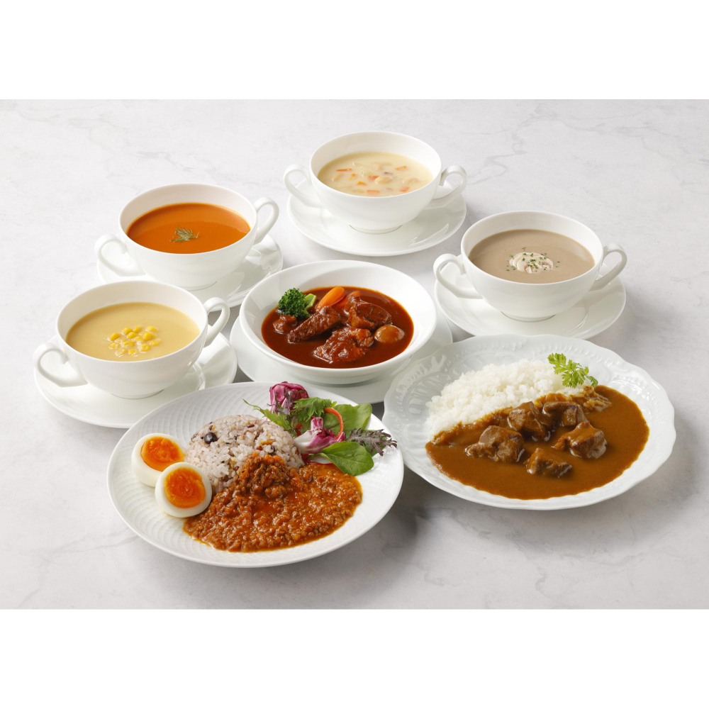 つぶ入りコーンスープ・パンプキンクリームスープ・10種野菜のクリームスープ・野菜のチャウダー・オニオンスープ・国産マッシュルームのクリームスープ・コンソメスープ・オマール海老のビスク・ドライカレー 各150g×1、ビーフカレー・ビーフシチュー・ハッシュドビーフ 各180g×1