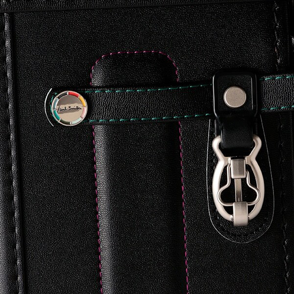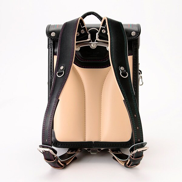 ポールスミスらしい配色のステッチに加え、カラフルな縁取りを加えたポールスミスオリジナルのカシメもさりげないこだわり。かぶせ裏は、色鉛筆柄で上品に仕上げています。背カンが肩ベルトを持ち上げるので背中にぴったりフィットし負担を軽減します。背中と肩ベルト裏に抗菌仕様のクラリーノロベニカを使用で通気性・クッション性にも優れています。防犯ブザーなどが取り付けられる便利なDカン付き。A4フラットファイル対応のワイドサイズ、125mmマチでしっかり収納できます。