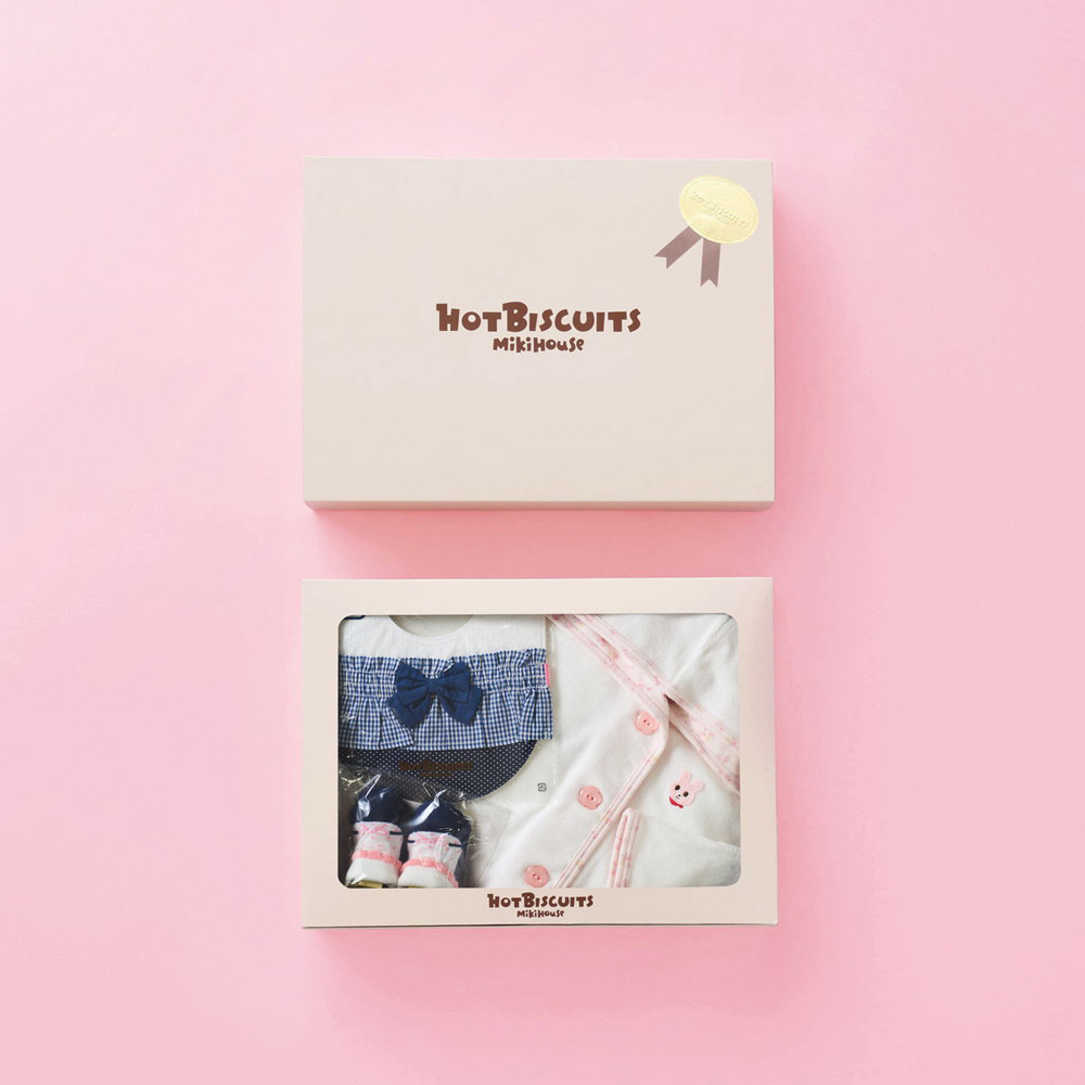 ミキハウスホットビスケッツのギフトセット。春から夏にかけてのベビーちゃん用のアウターとしておすすめのおでかけポンチョ、かわいいスタイ、ソックスとBOXのセットです。