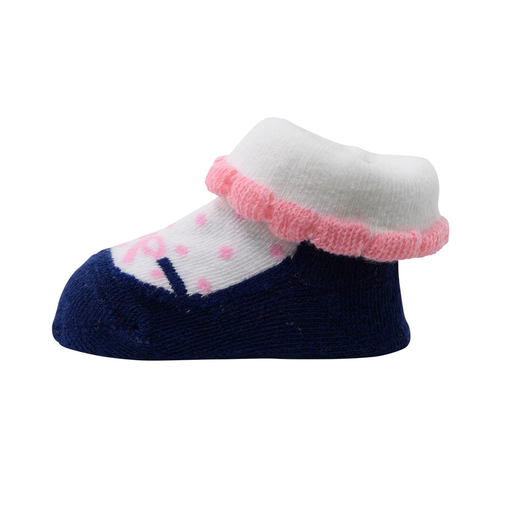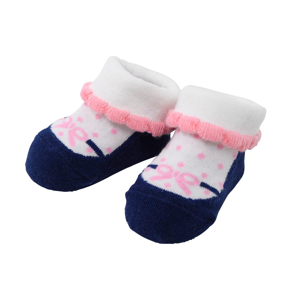 カーディガンなどのお袖に腕を通すのが苦手なベビーちゃん。ポンチョなら、パッと肩に掛けて前のホックボタンを留めるだけでOK。手を動かすようになると袖口のボタンを留めることができて動きやすい仕様に。紫外線対策はもちろん、夏場は室内での冷房対策にも。新生児から2歳頃までとご着用期間が長いので、サイズ選びが難しいギフトにポンチョはおすすめ。スタイは付けると「初めてのフォーマル」スタイルに。簡単におでかけスタイルになるかわいいデザインです。バレエシューズ風デザインのベビーソックス。おでかけの機会が多くなってくると、ちいさな足を保護するソックスが必須アイテムになってきます。お箱に入っているので出産祝いなどのギフトにぴったり。