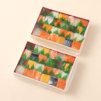 【冷凍便でお届けします。解凍に時間がかかりますのでご注意ください】まぐろ、サーモン、イカ、エビ、サバ、タイの押寿司と玉子焼きの彩り豊かな一品です。一口サイズにカットした押寿司を鮮やかなモザイク模様に並べました。お好きな具材でトッピングするとさらに華やかに食卓映えします。ご自宅用にはもちろん、パーティーや大切なおもてなしにもおすすめです。新潟県産のお米を使用したシャリは旨味がありふっくら。こだわりの米酢・砂糖・昆布などで仕上げました。急速冷凍で、鮮度や美味しさを保ったままお届けいたします。流水解凍または自然解凍でお召し上がりいただけます。