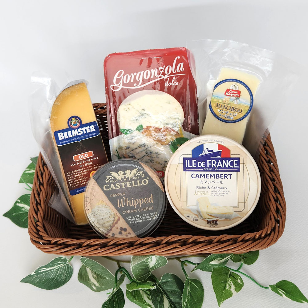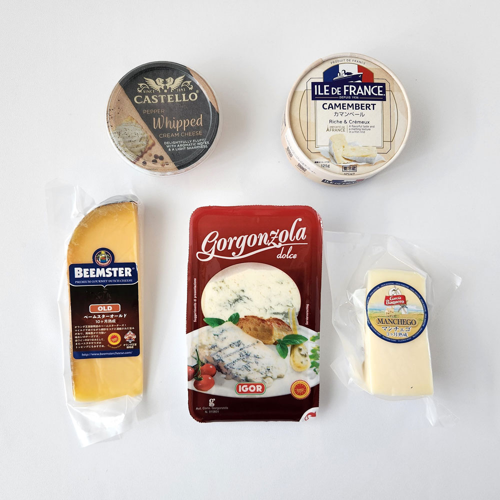 ゴルゴンゾラドルチェ 150g、ベームスターオールド 150g、イルドフランスカマンベール 125g、マンチェゴ 80g、キャステロホイップペッパー 125g