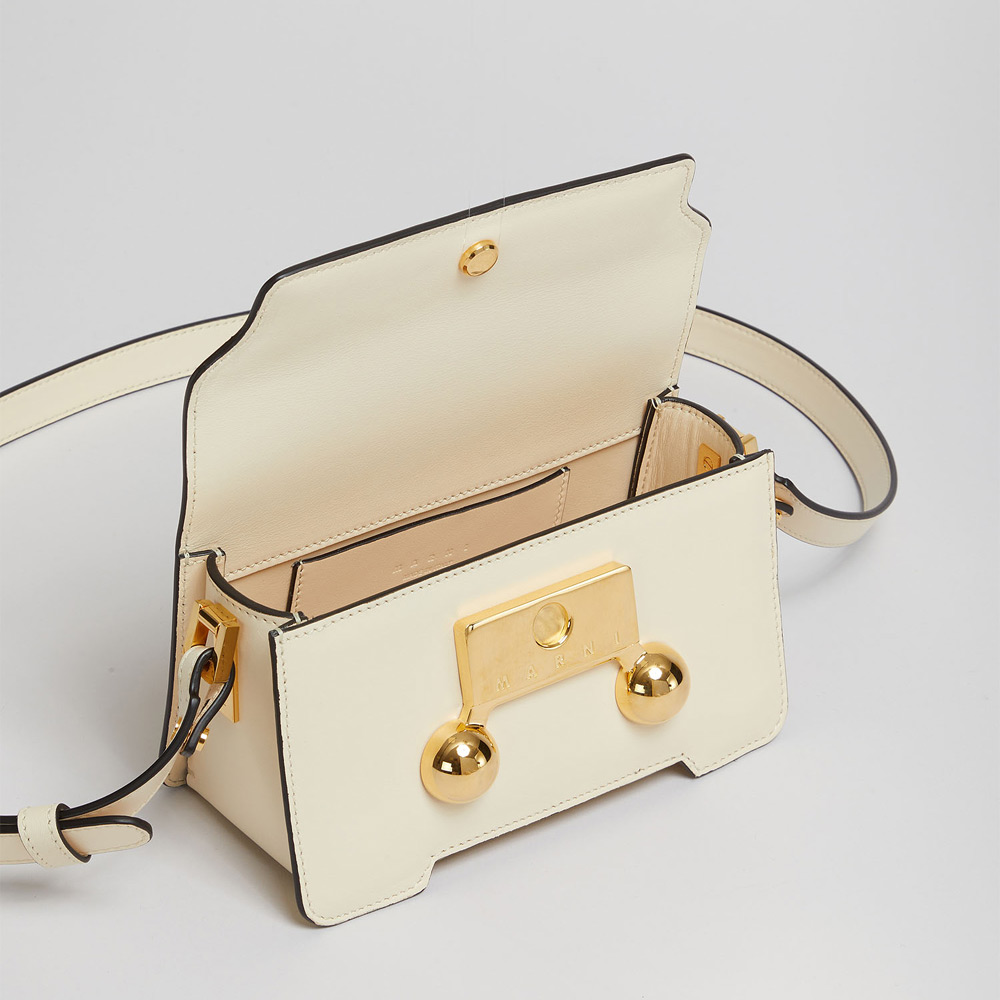 カーフレザー製の“TRUNKAROO”ミニショルダーバッグ。シングルコンパートメント、マグネット開閉式。ショルダーストラップを取り外して、クラッチバッグとしても使用できる2WAY仕様。