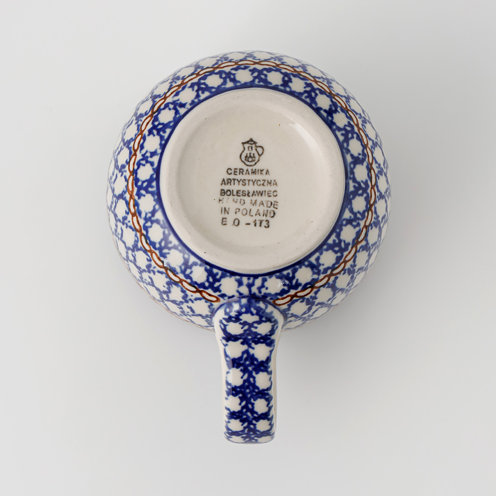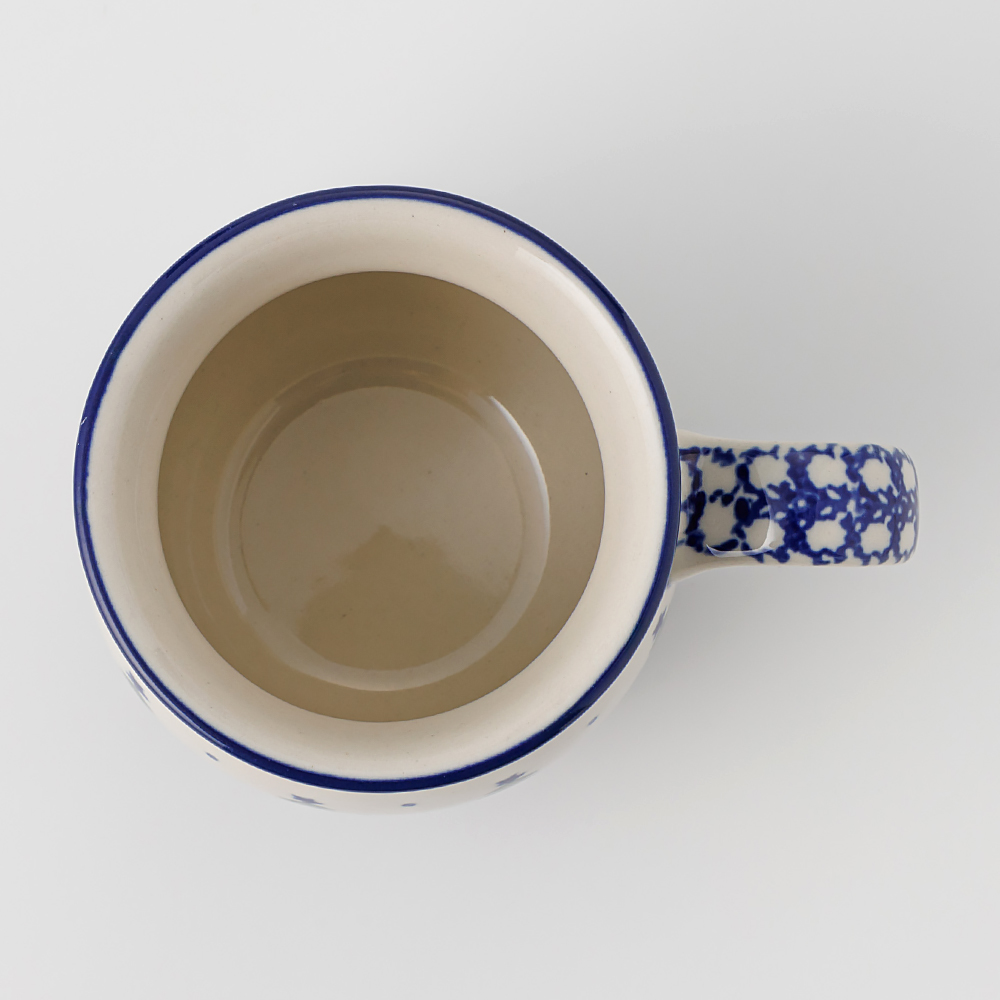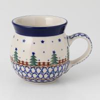 温もりのある形や洗練されたデザイン、日常使いに適した高い品質と耐久性で世界各国の家庭で愛されるハンドメイドで絵付けされた食器です。もみの木と青い星のモチーフがぐるりと並ぶデザインはクリスマスの夜を思わせる大人っぽい印象です。このマグカップの形状は湯気が出にくく冷めにくいように作られています。ぽってりとしたデザインは持ちやすく、手に馴染みます。