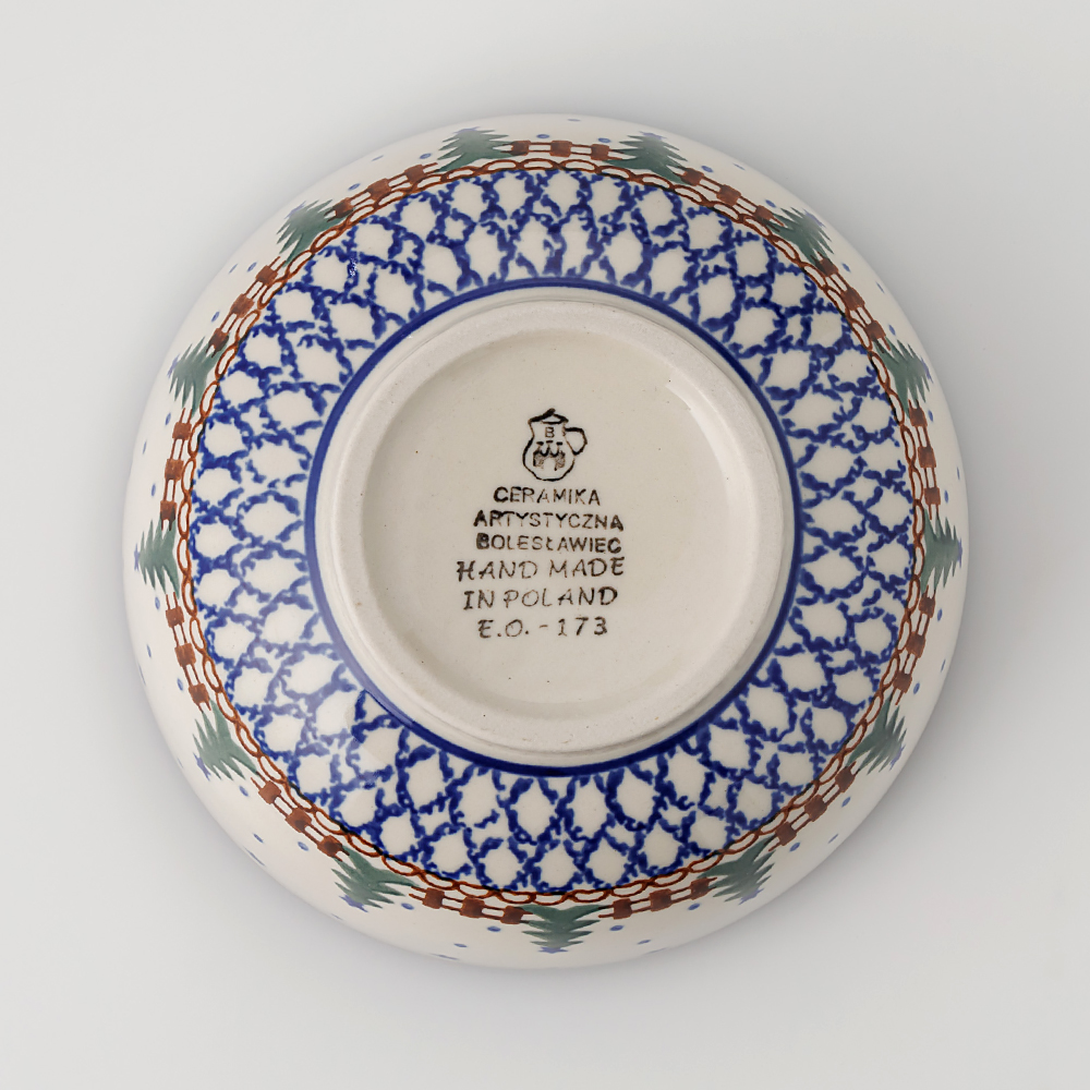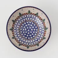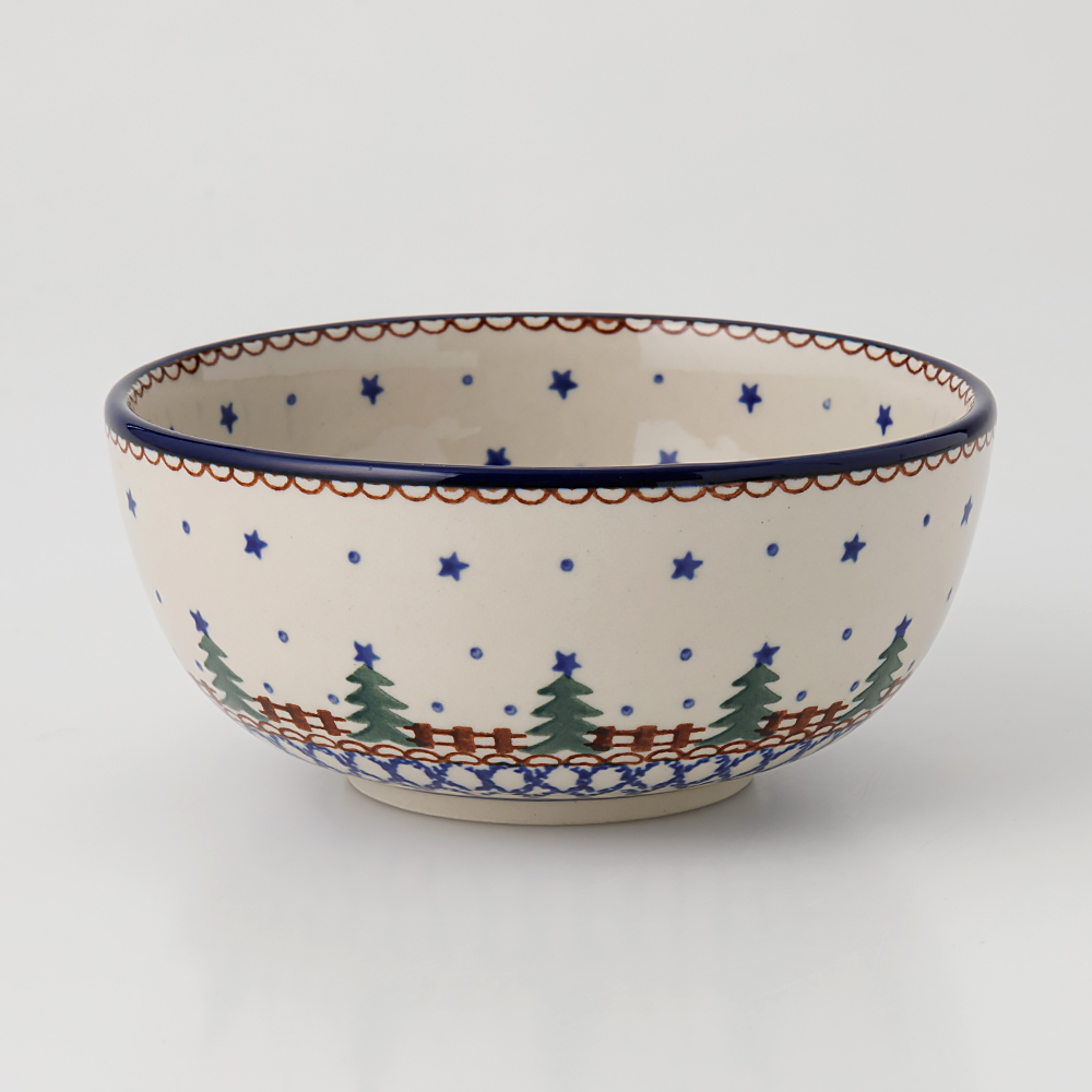 温もりのある形や洗練されたデザイン、日常使いに適した高い品質と耐久性で世界各国の家庭で愛されるハンドメイドで絵付けされた食器です。もみの木と青い星のモチーフがぐるりと並ぶデザインはクリスマスの夜を思わせる大人っぽい印象です。ちょうどよいサイズ感のボウルはサラダや取分けにぴったりで、ぽってりとしたデザインは持ちやすく、手に馴染みます。