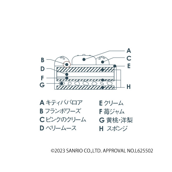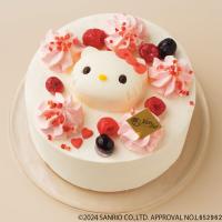 【冷凍便でお届けします。解凍まで時間がかかりますのでご注意ください。】洋梨と黄桃を生地でサンドし、クリームでデコレーション。ハローキティをかたどって練乳ムースやフランボワーズをかわいくトッピングしました。