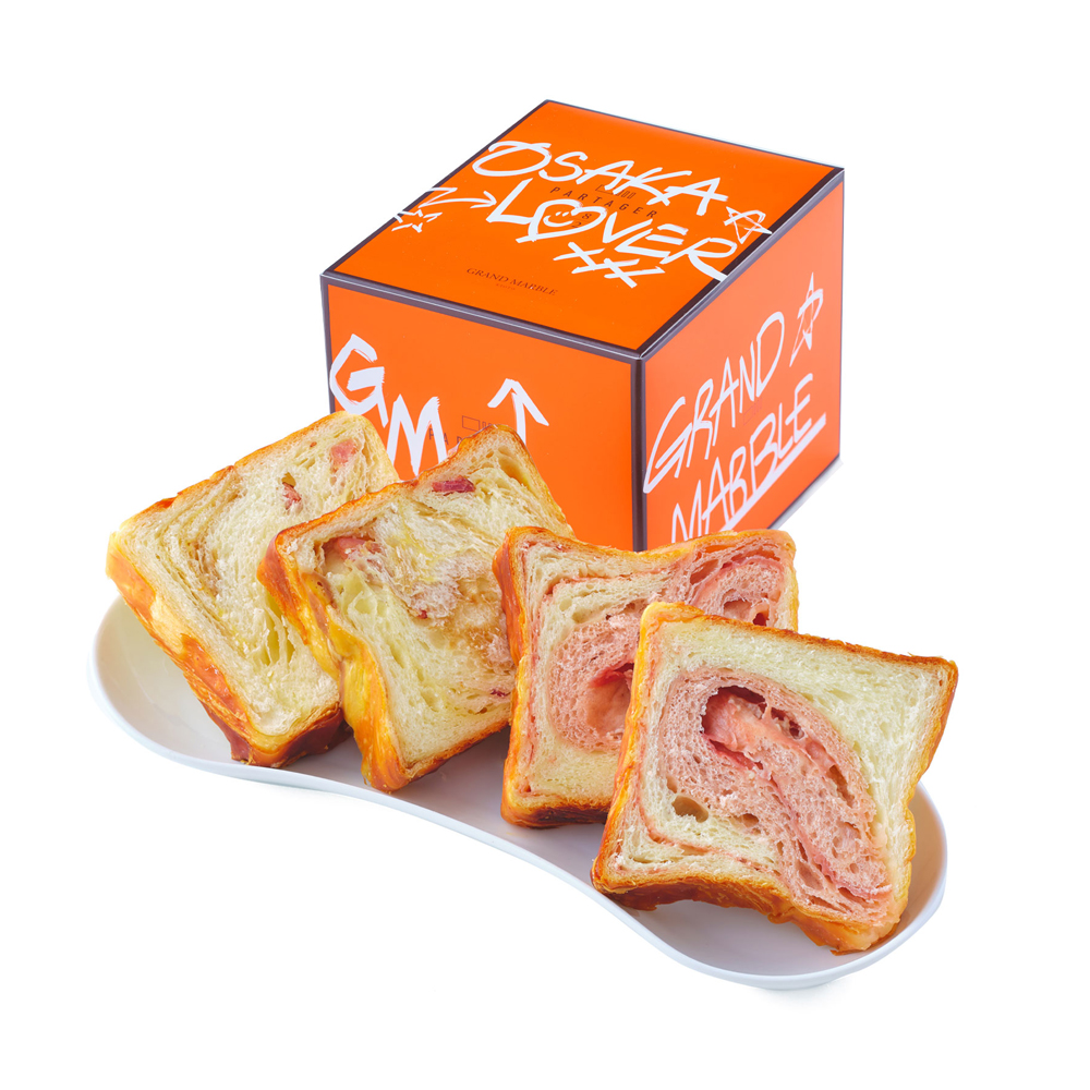マーブルデニッシュをスライスし、1枚ずつ個包装にしました。定番の「京都三色・メイプルキャラメル・モカショコラ」が各4枚と、大阪限定商品の「苺ミルキー・メイプルチェダー」が各2枚ずつ入った16枚セット。グランマーブル人気のお味をお楽しみいただけます。