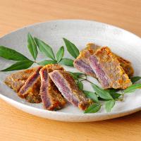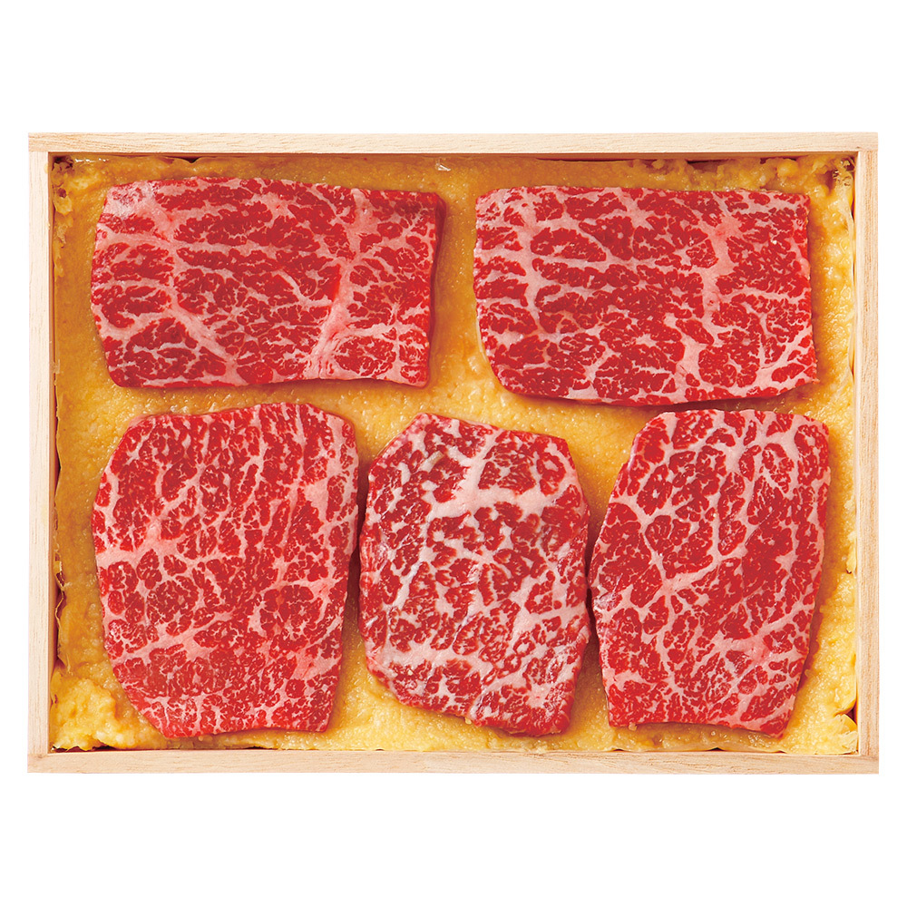 黒毛和牛の雌牛赤身のみ使用の「牛肉の味噌漬」。肉の旨味と味噌の香りがお口に広がります。