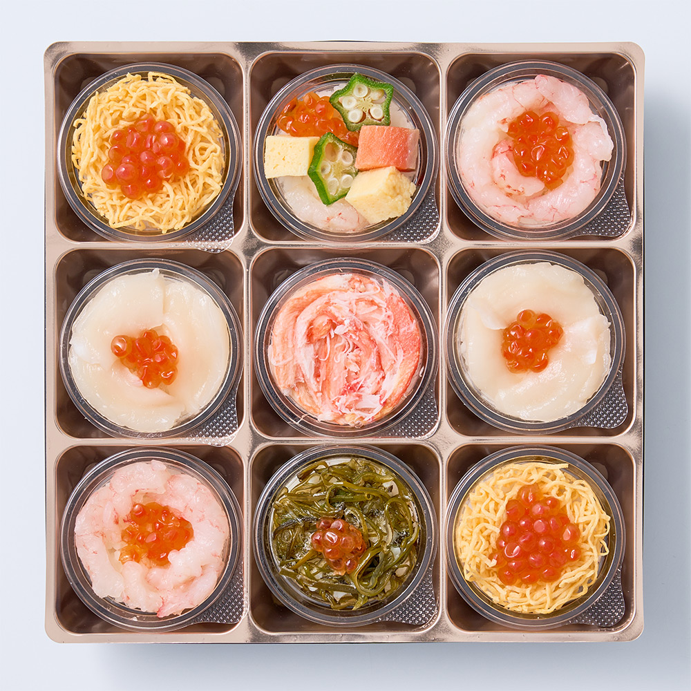 酢飯の上に、北海道産のほたて・いくら・紅ズワイガニをはじめ、甘えびやサーモン、めかぶと彩り豊かな素材を乗せ、直径5cmほどのカップ寿司に仕上げました。並べるだけで食卓が華やかになり、2~3口で食べられるプチサイズなので、オードブルや締めのひと品にピッタリです。クリスマスや年末年始などホームパーティーにどうぞ。