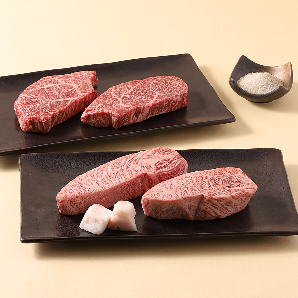 脂肪が適度に入り、濃厚な味わいがあるイチボと脂が少なくあっさりとしているランプ。同じモモ肉の部位違いをお楽しみください。