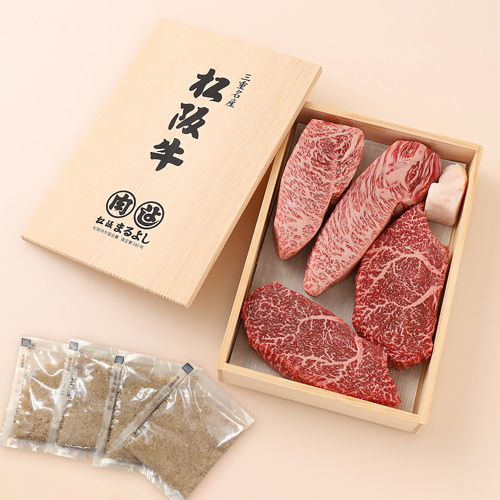 松阪牛イチボステーキ150g×2枚、松阪牛ランプステーキ150g×2枚、ステーキ調味料10g×4袋