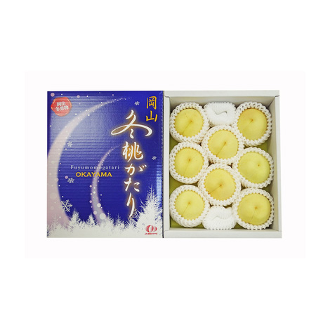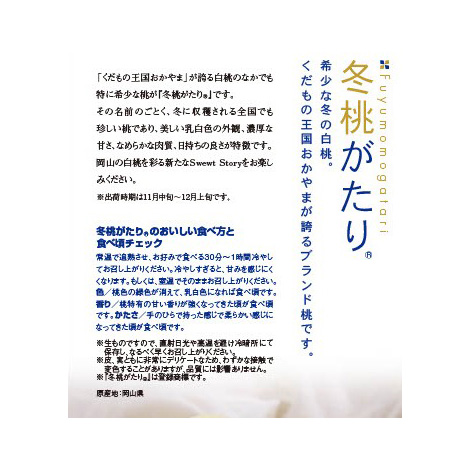 冬桃がたりの収穫は11月下旬となる極晩生品種。小ぶりでも糖度は15度以上と高く、果肉はしっかりとした歯ごたえです。高級ギフトとして注目され、果物王国・岡山の中でも期待のニューフェイスです。