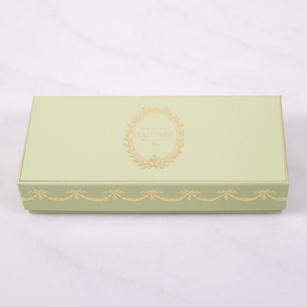 ラデュレグリーンの洗練されたマカロンボックスに入った定番人気のマカロン12個の詰合わせ。