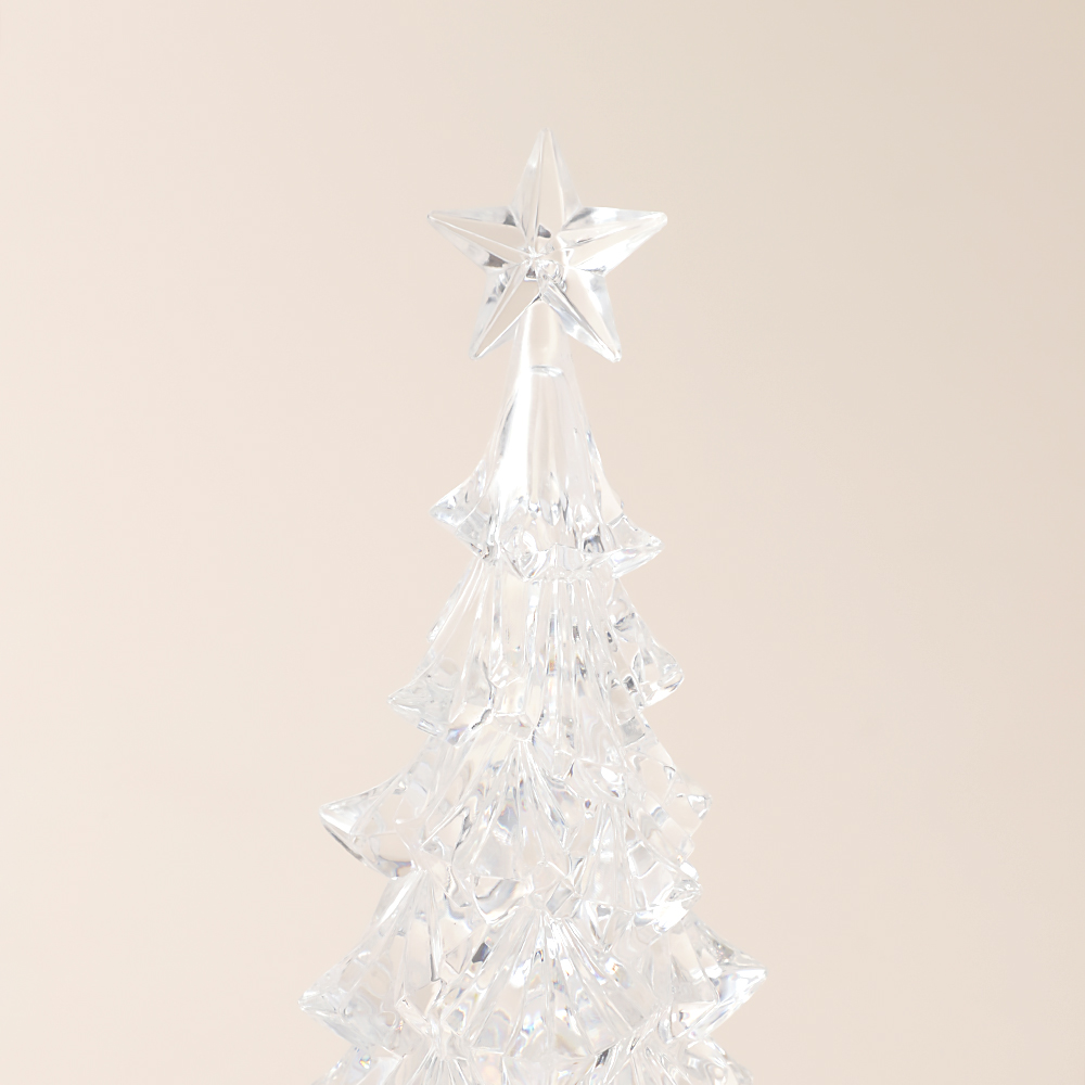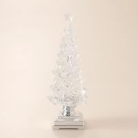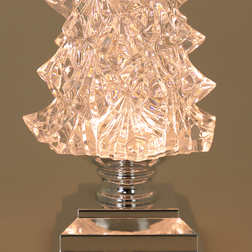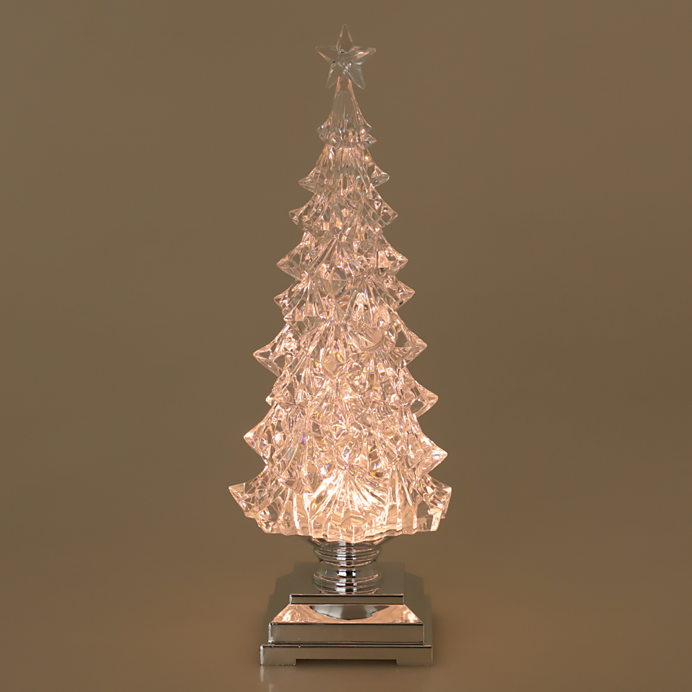 まるで氷の彫刻のように透明なアクリル製のLEDライト付きクリスマスツリーオブジェ。ピンクがかった温かみのある光と共に、中のラメが舞い上がり幻想的な光景が広がります。シルバーの支柱と台座を合わせたスタイリッシュなデザインで、モダンなインテリアのクリスマス装飾にもお勧めです。これ一つでもクリスマス気分を十分に楽しめる存在感のあるツリーの置物です。