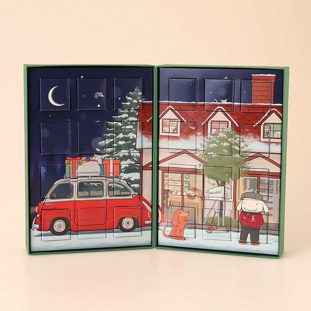 ひきだしを開けるとシュシュクルのお菓子が。ボックスをひっくり返していくとかわいい絵がクリスマスにかわります。