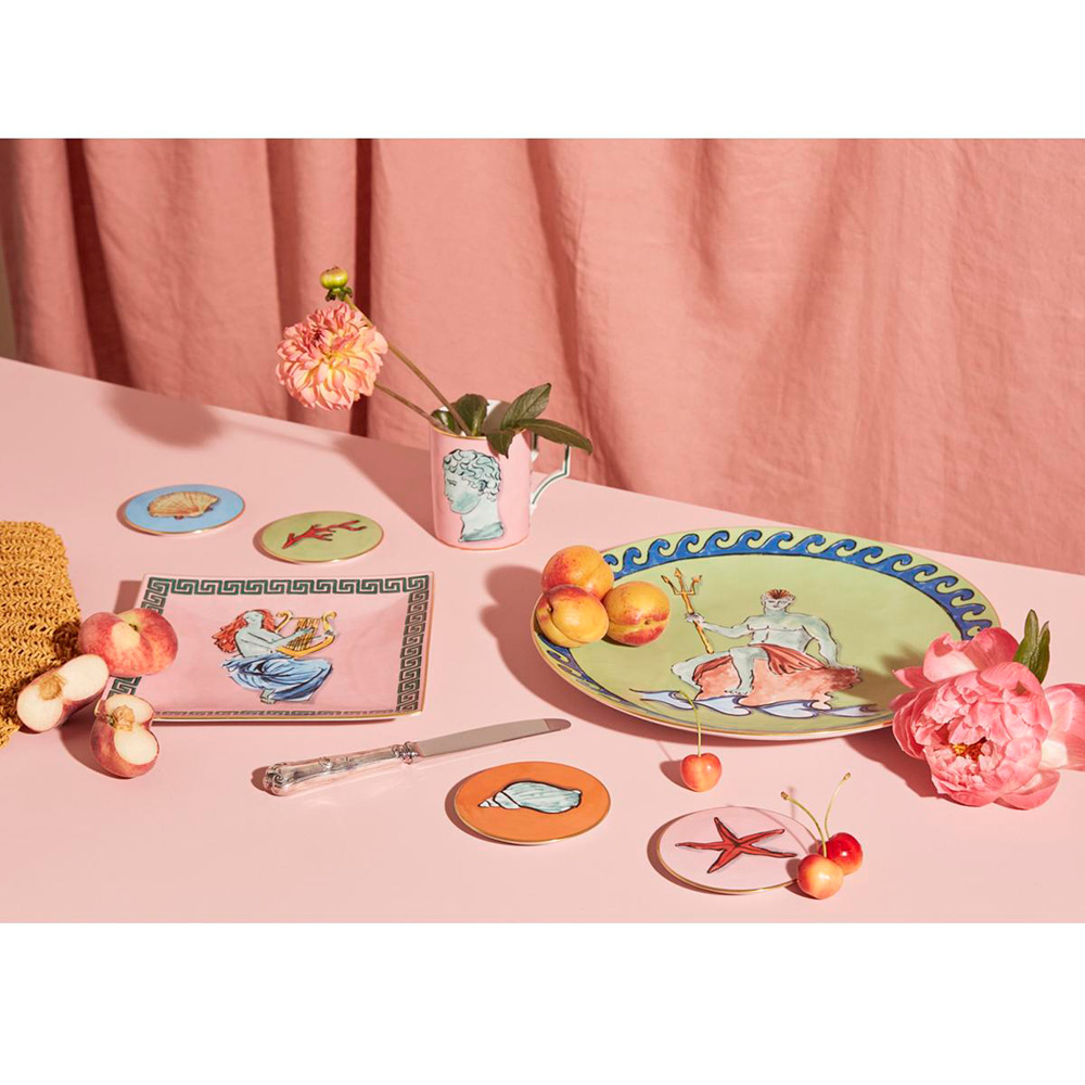 イギリス人デザイナー ルーク エドワード・ホール による「ネプチューンの旅」という名のコレクション。古代ギリシャ・ローマ神話にインスパイアされ、海の神・ネプチューンを主人公に、個性的なモチーフが大胆な色彩とともに手描きのタッチで描かれています。