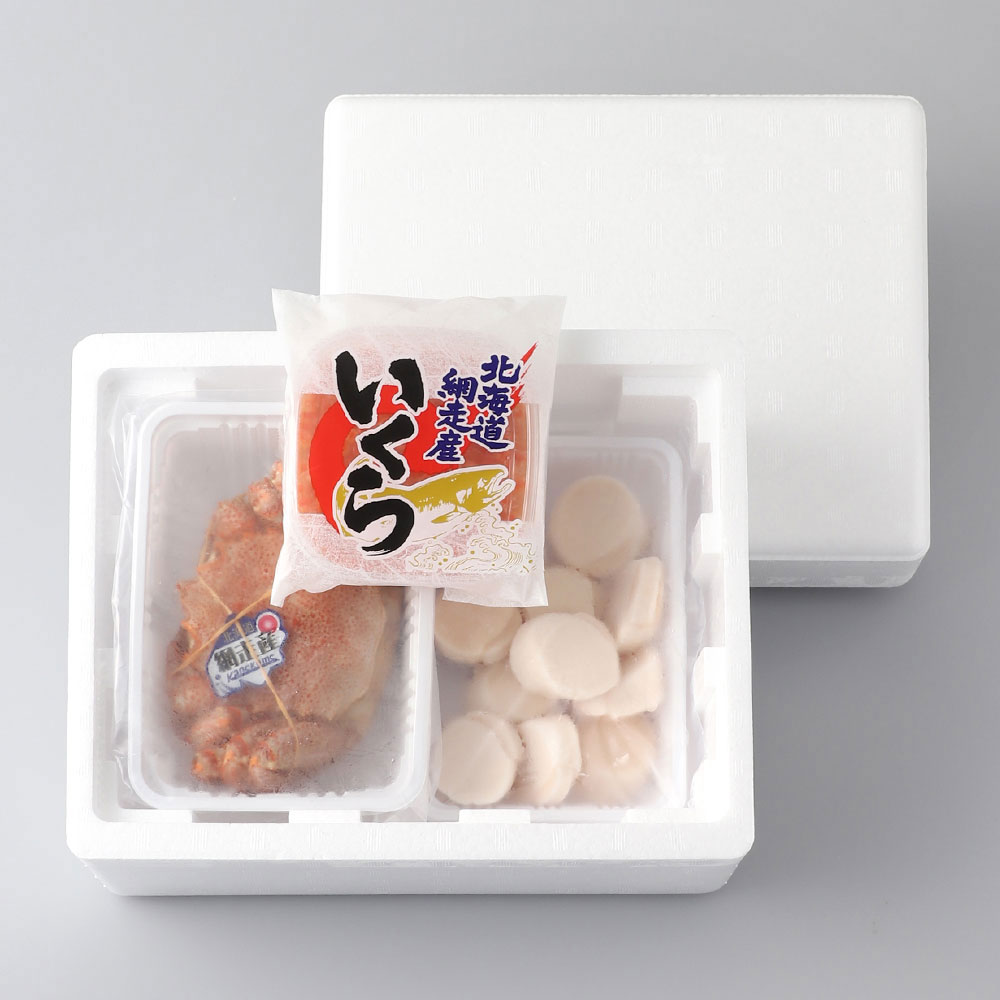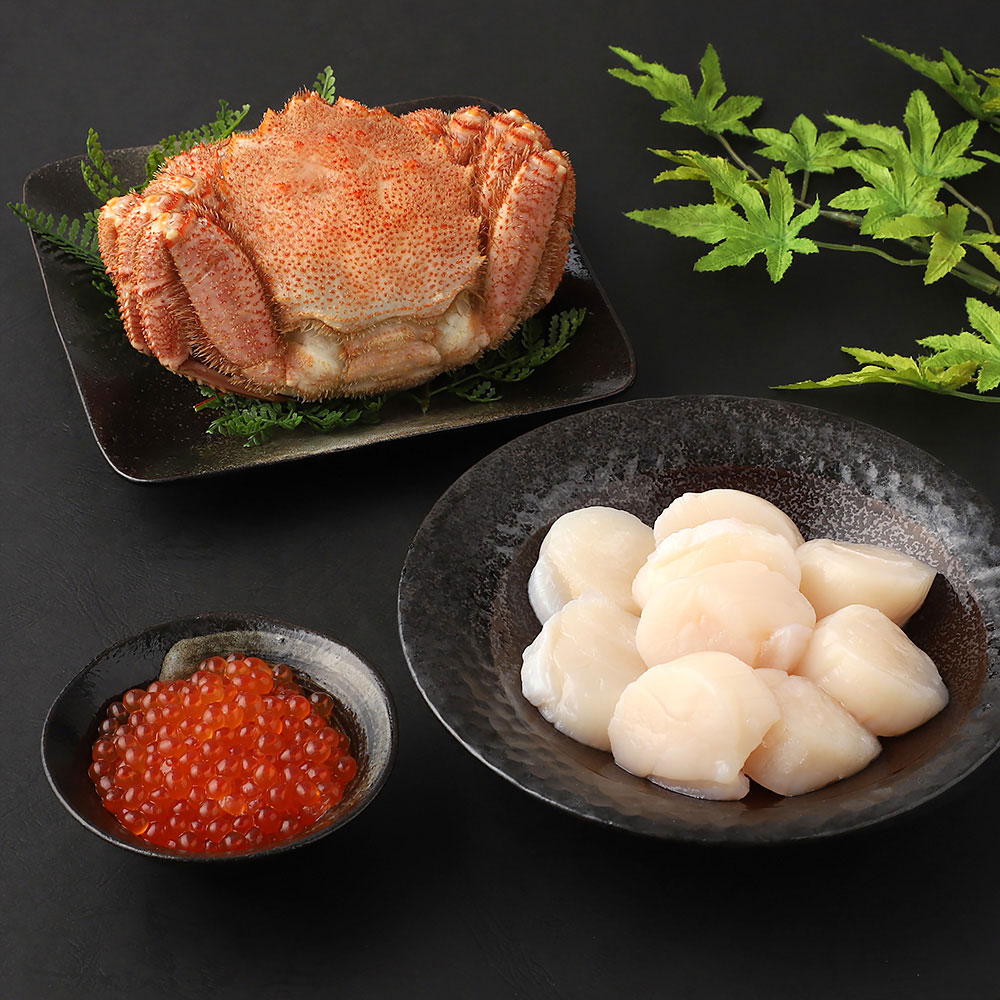 毛ガニと、ほたて貝柱、いくら醤油漬を詰合せ。北の恵みを一度に楽しめるお買い得なセットです。