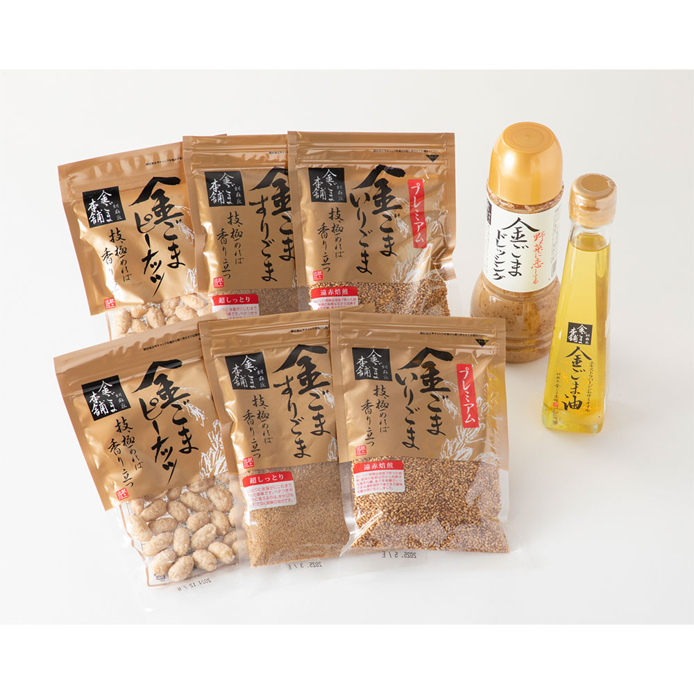 プレミアム金ごまいりごま70g×2袋、プレミアム金ごますりごま55g×2袋、金ごまピーナッツ70g×2袋、金ごまドレッシング285ml、金ごま油115g 計8点