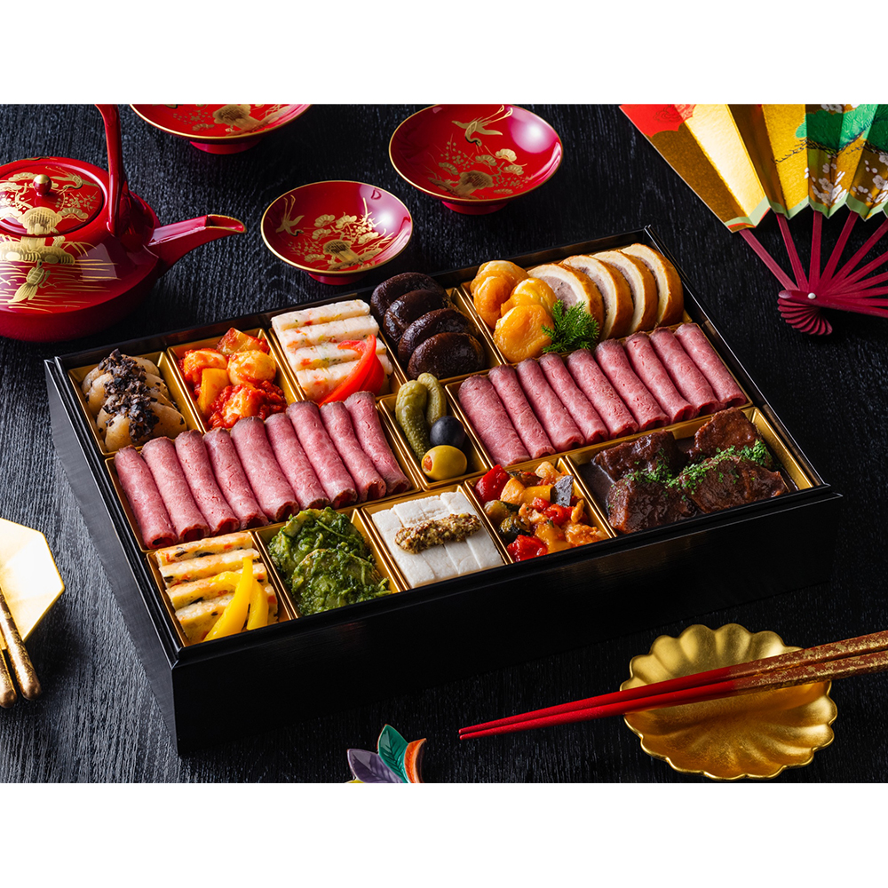 海老のアンチョビ入りタプナードソース、パプリカとモッツァレラチーズ トマトソースカプレーゼ、サーモンテリーヌ、赤パプリカマリネ、干し椎茸バルサミコ酢煮、クリームチーズ杏子、ハンバーグのパイ包み焼き、黒毛和牛モモローストビーフ(赤ワイン漬け)、コルニッション、鶏と野菜のチーズ焼き、黄色パプリカマリネ、帆立の葱生姜ジェノベーゼソース、ポーク白ワイン煮 粒マスタードソース、ラタトゥイユ、黒毛和牛赤ワイン煮込み、ローストビーフソース【別添】、西洋わさび【別添】