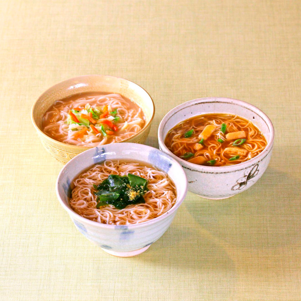 お湯かけ3分でお召し上がりいただける本格手延べ三輪素麺。人気3種類の味でお楽しみいただけます。