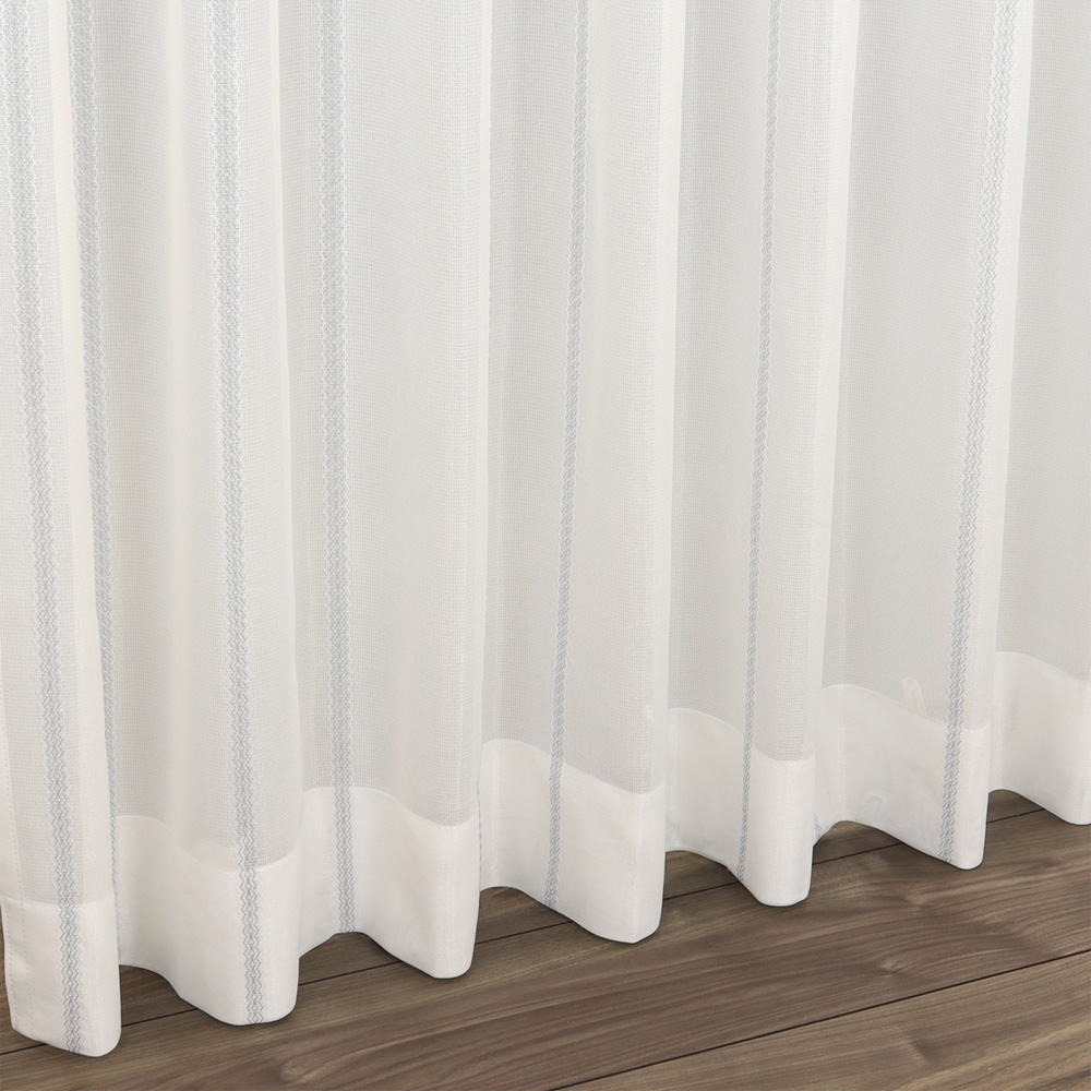 ナチュラルカラーの糸でチュールレースのような模様のボーダーをデザインした遮熱ミラーレースカーテンです。