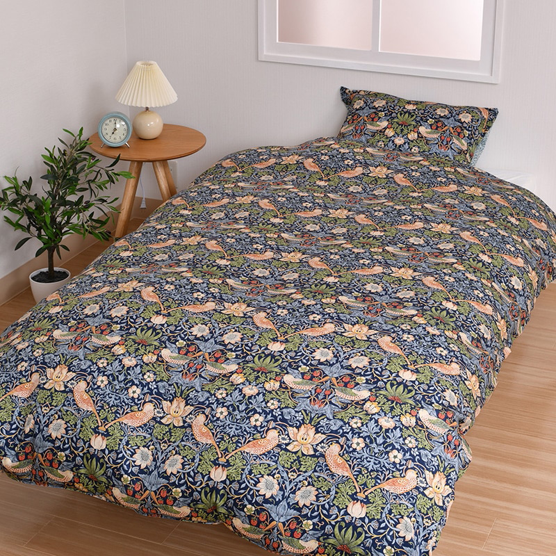 19世紀、装飾デザインの新しい時代を切り開いたウィリアム・モリス。『モリス商会』の創業から150年以上たった今も輝き続けるモリスの独創的なデザインを生かしたコレクションをお届けします。こちらは人気のいちご泥棒柄の掛ふとんカバーです。裏地もモリスデザインのウイロー柄を採用し、リバーシブルでご使用いただけます。綿100%サテンで触り心地の良いカバーです。