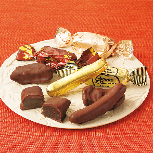 オレンジピール1袋(14本入)、梨チョコ・いちじくチョコ・ポームダムール各80g×1袋、4種計4袋