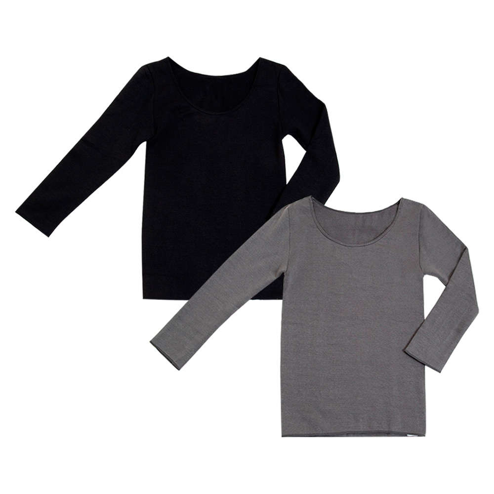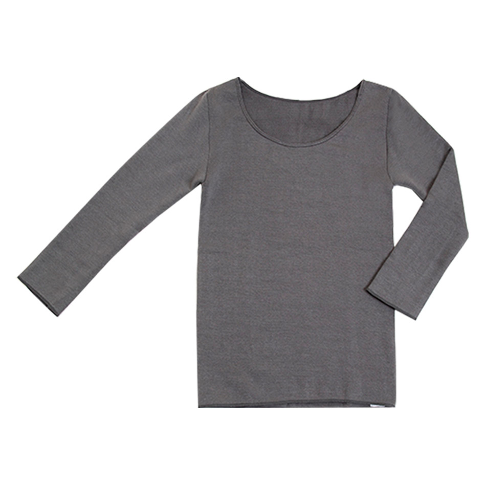 毛布のようにふわふわとした裏起毛生地なのであたたかく心地よい着用感です。丸胴編みで脇に縫い目がないため肌あたりがよく横臥時も快適です。襟ぐりを少し広くした8分袖のデザインなのでお洋服からチラ見えしにくいです。優れた吸湿発熱性と保温効果のある「ソリスト(R)サーモ」を使用しています。グレーとブラックの2色セット。