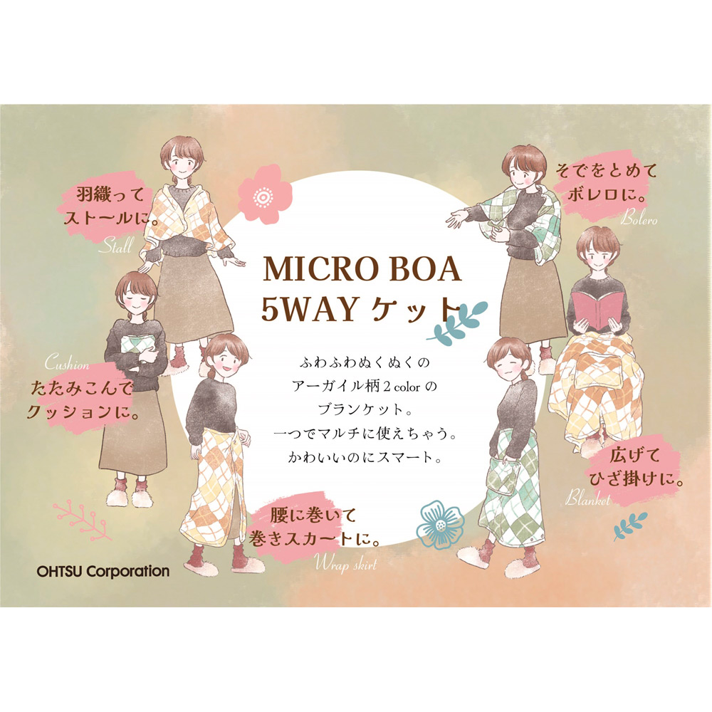 極細繊維(マイクロファイバー)を使用、軽量でやわらかタッチの肌触りです。ボタンを留めればポンチョやケープ、巻きスカート、ボレロに。ポケットに収納すればクッションにもなります。リビングでくつろぐ時や、お出かけの際にご使用いただけます。