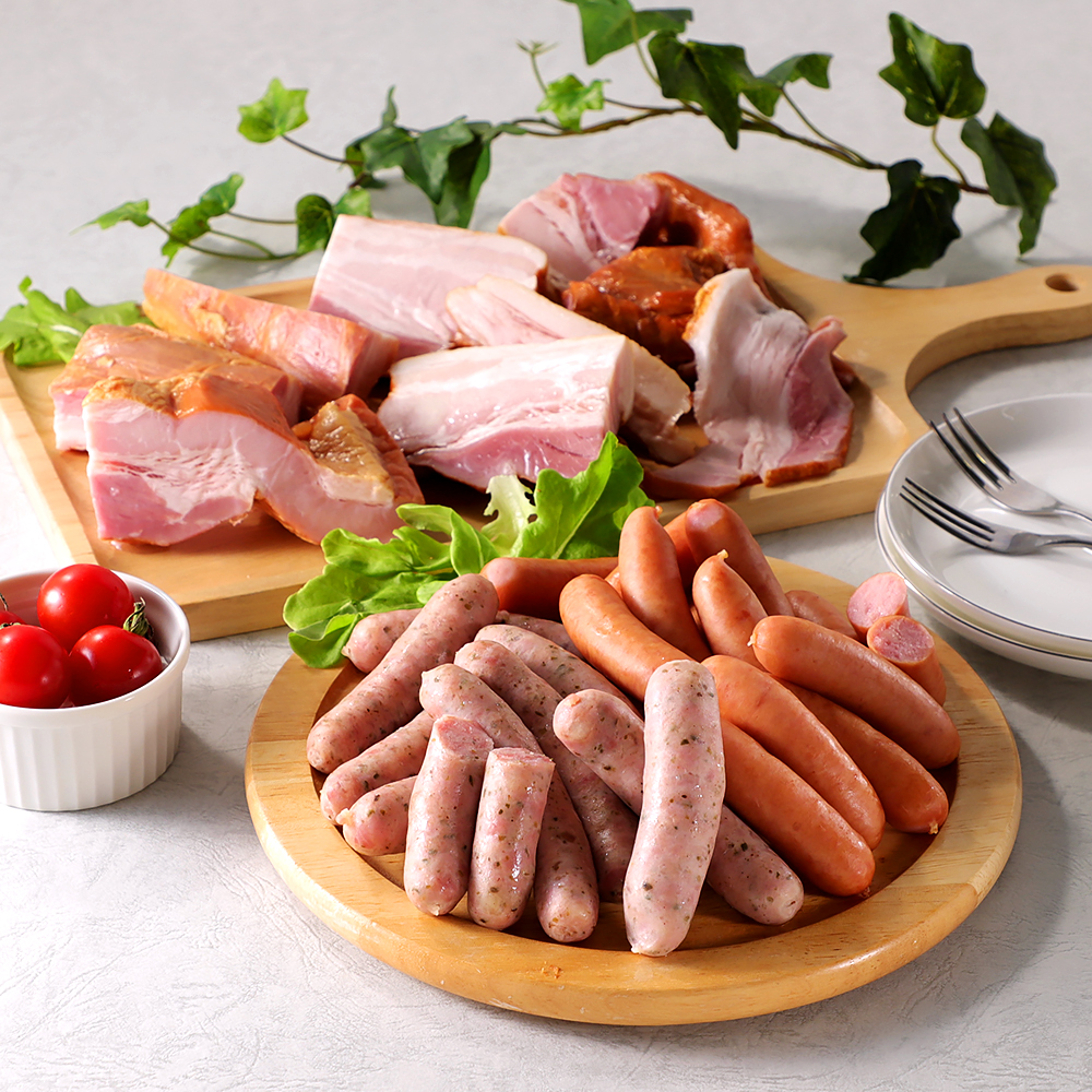 マジョラムソーセージ80g×4、朝食あらびきウインナー72g×4、ベーコン切落し250g×4