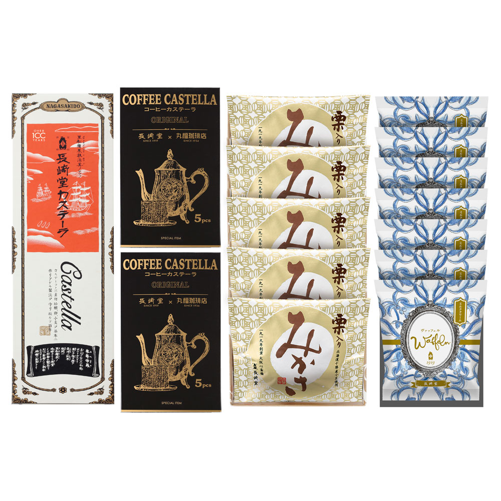 長崎堂のカステーラは、焼粉(ベーキングパウダー)を使わず卵と砂糖の力で自然に焼き上げ、それらの持つ風味を活かしカステーラの独自性を大切に作っています。定番のカステーラと丸福珈琲とコラボした珈琲カステーラ、栗入りのみかさと堅焼き洋風せんべいのヴァッフェルを詰め合わせてお届けします。