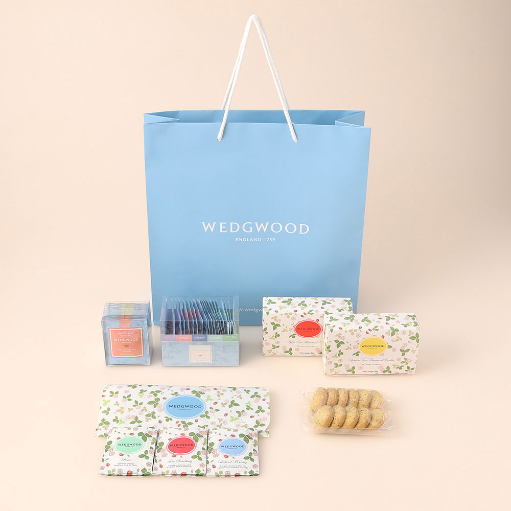 シグニチャーティーバッグ(アールグレイ、イングリッシュ ブレックファスト、ウェッジウッド オリジナル、マハラジャ ダージリン、セイロン アフタヌーンティー 計20袋)、ワイルドストロベリーティーバッグ(ピクニック、ファイン ストロベリー、ウィークエンド モーニング 計9袋)、ハーブティーバッグ(レモン&ジンジャー、レモングラス&ミント 計9袋)、アップルティークッキー80g、レモンティークッキー80g