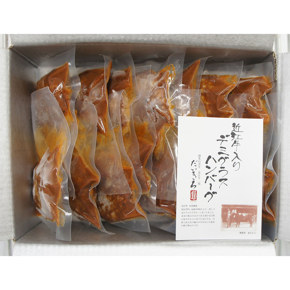 やわらかな肉質と上品な脂の旨みを持つ近江牛と国産牛を使ったジューシーなハンバーグです。濃厚なデミグラスソースが肉の旨みを引き立てます。調理は簡単でお湯で温めるだけでお召し上がりいただけます。
