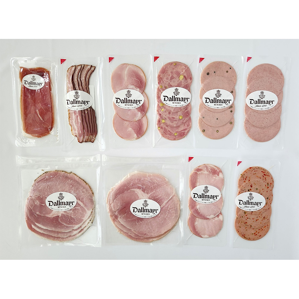 シュペックベーコン65g、シンケンブルストファイン55g、カセラーロレ38g、ロールシンケン47g、パプリカリオナー55g、カイザービアシンケン50g、プフェファーリオナー55g、デリカテスザフトシンケン190g、ゲヴュルツシンケン190g、ハモンセラーノ30g