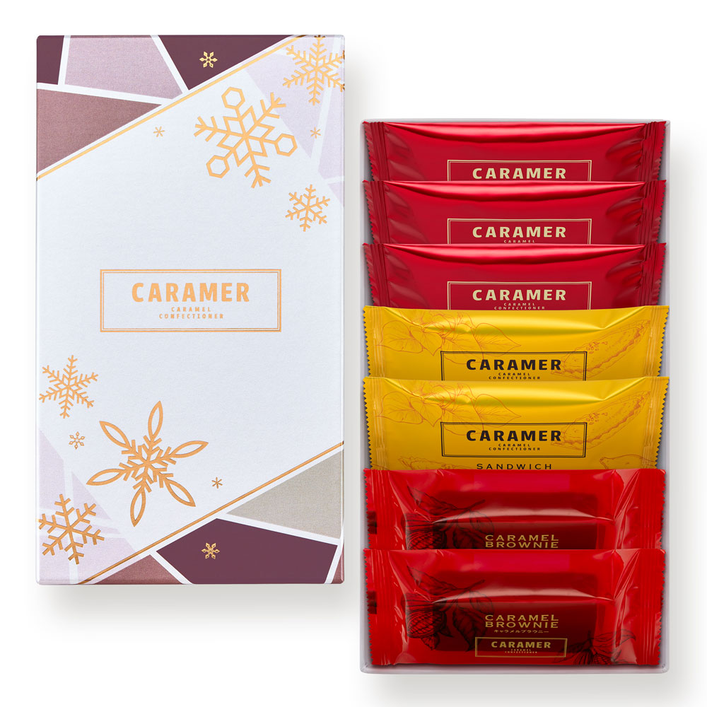 CARAMER定番人気の「キャラマーサンド」「キャラメルブラウニー」に期間限定の味「キャラマーサンド スイートポテト」を、雪の結晶をあしらったデザインボックスに詰め合わせました。