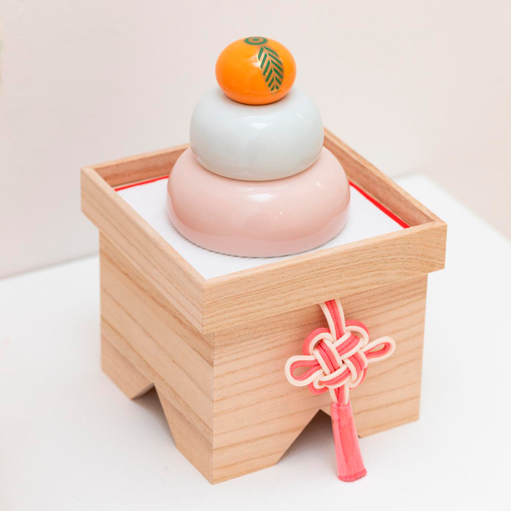 新しい年を晴れやかな気持ちで迎えるために、日本の材料にこだわって製作されたとっておきの鏡餅を飾りませんか。紅白の鏡餅と橙はすっきりと美しい磁器製です。三宝に付けた飾り結びは、「菊結び」で延命長寿を表します。桐材でつくられた外箱を、三宝としてご使用ください。出番が終わったら、大きい餅の中に小さな餅、ダイダイをコンパクトに収納することが出来ます。